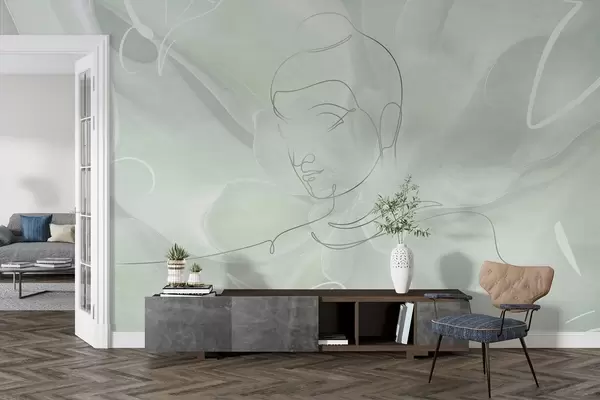 Fototapet Blomsterabstraktion med Buddha linjeteckning, gröna färger Nr. w04004v3