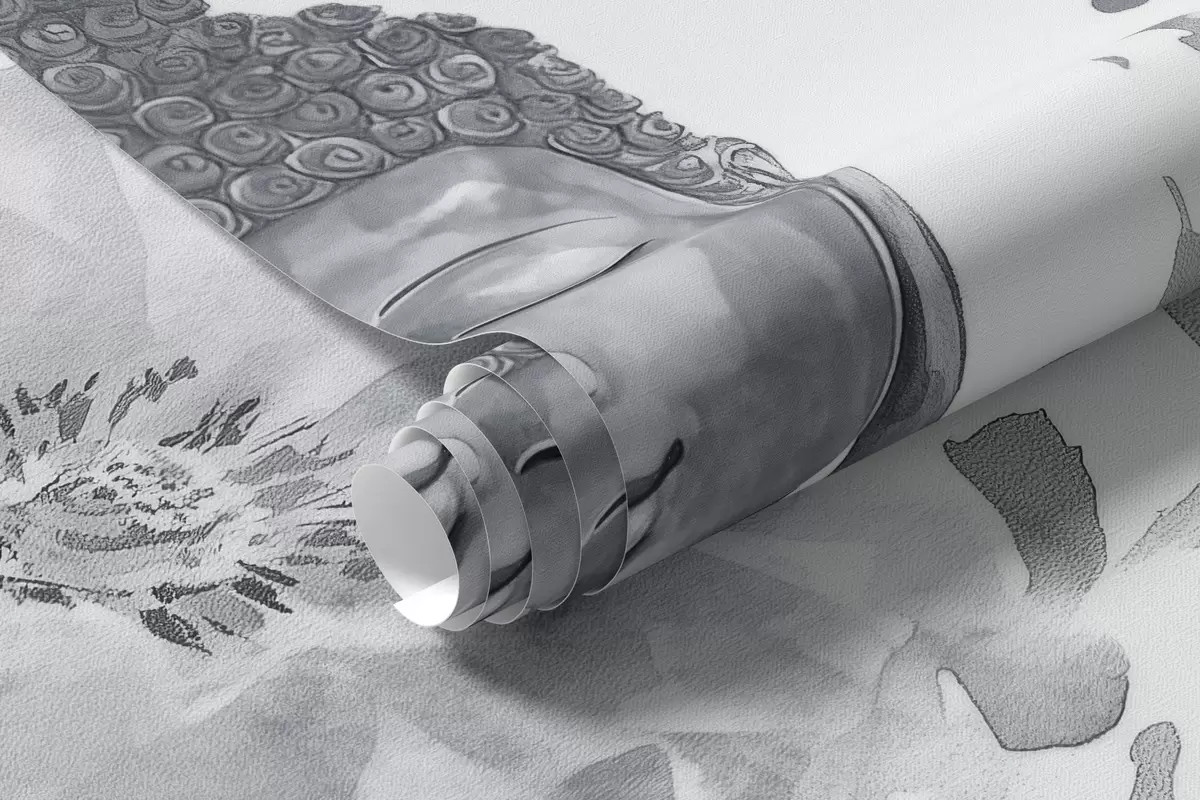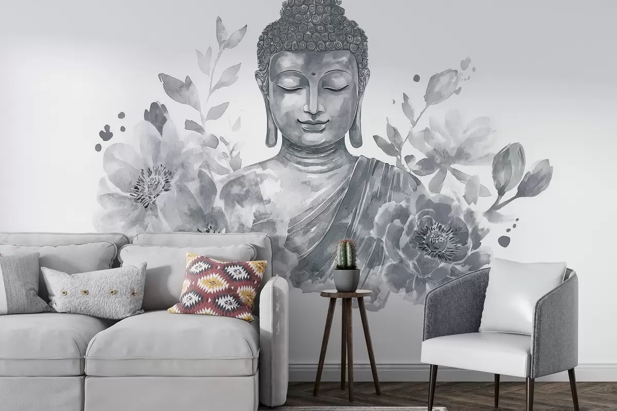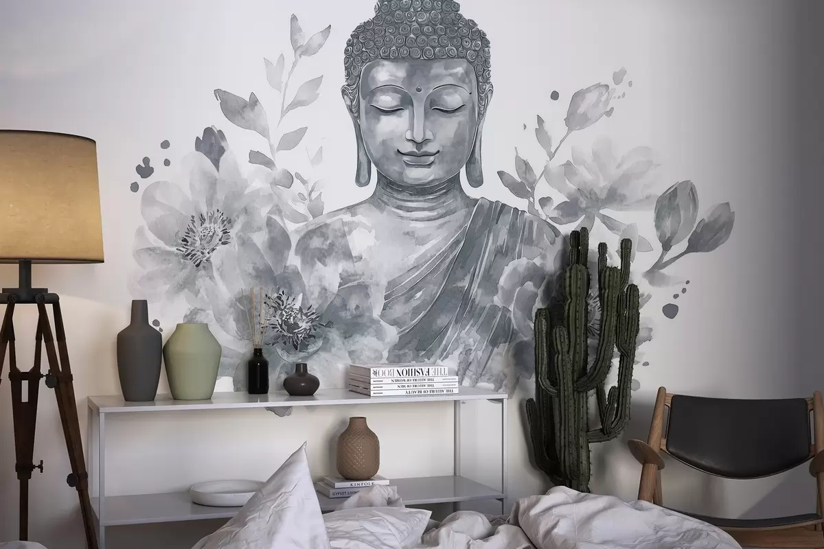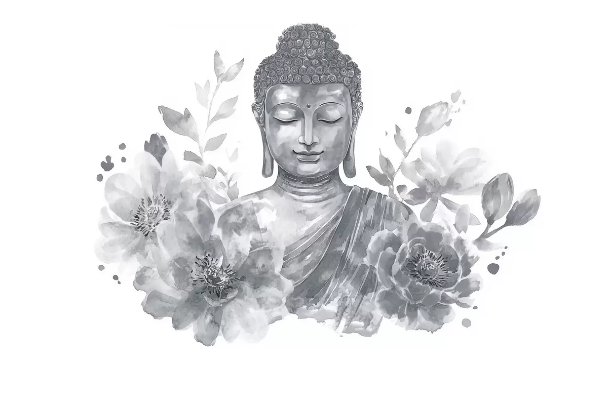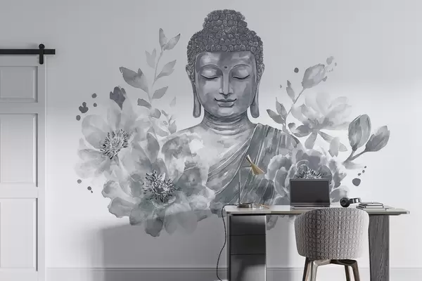 Fototapet Akvarell Buddha med blommor, andlig, grå färgpalett Nr. w04005v1