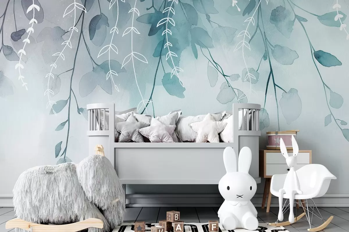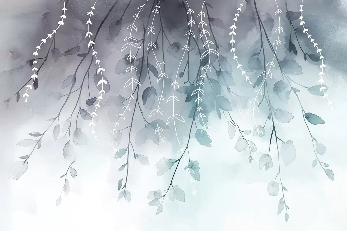 Fototapet Grenar med blad i akvarellstil, naturliga akvamarinfärger Nr. w04007v3