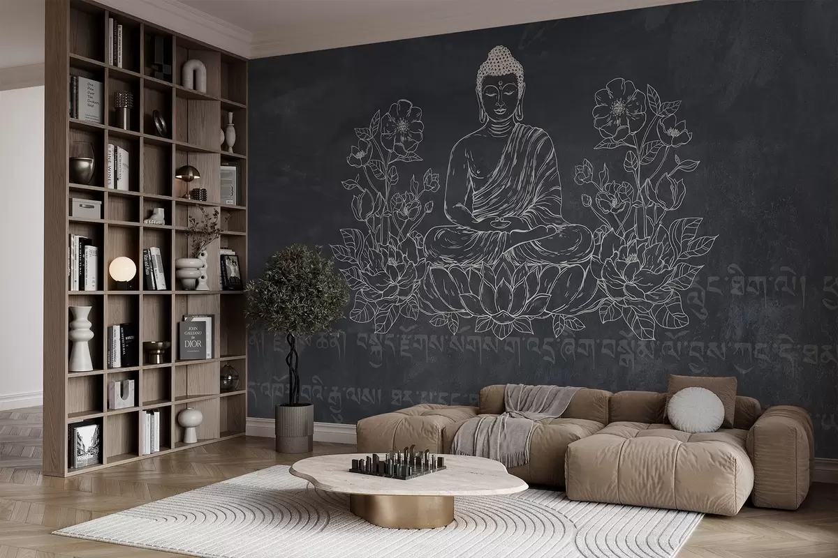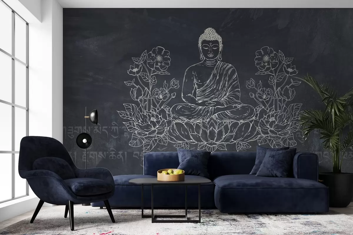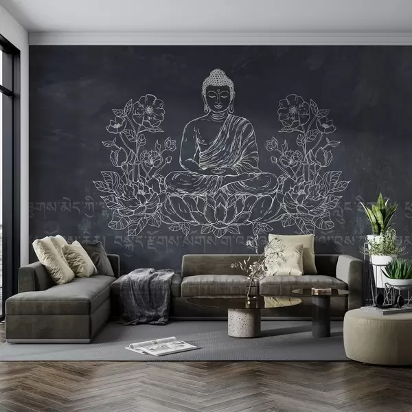 Fototapet Mediterande Buddha med lotusblommor, linjekonst, orientalisk, mörk bakgrund Nr. w04008