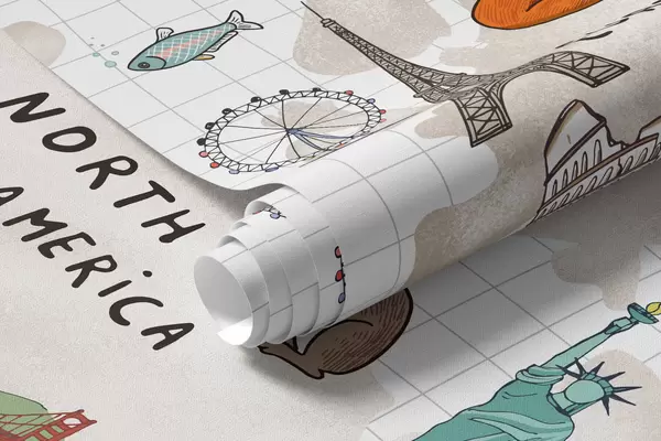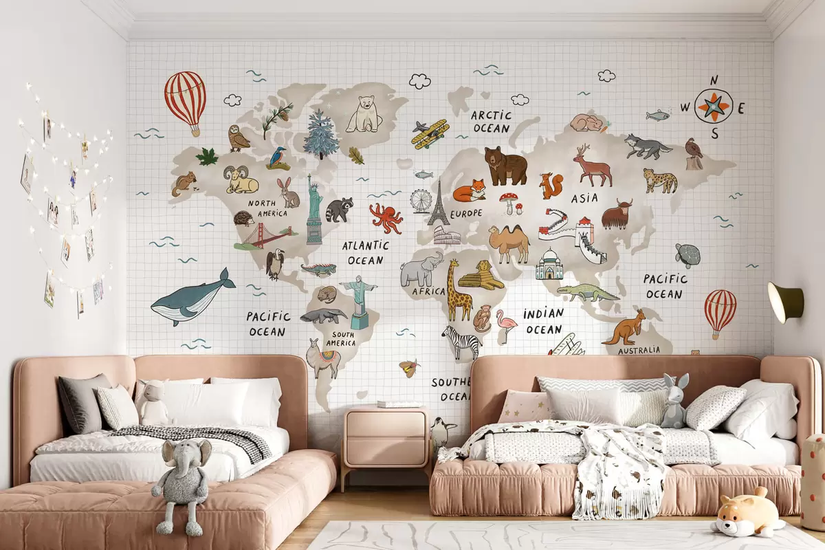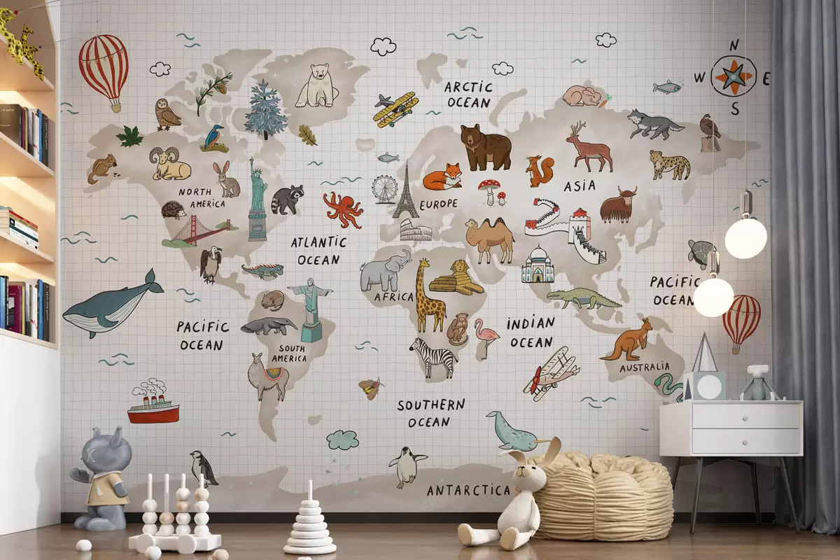 Fototapet Världskarta med djur och landmärken Nr. w04011