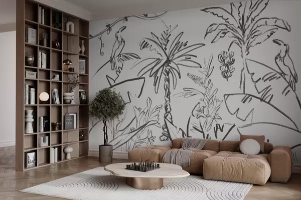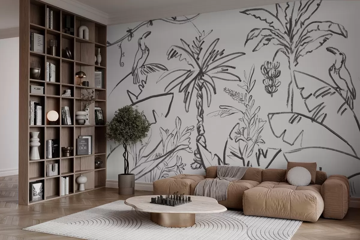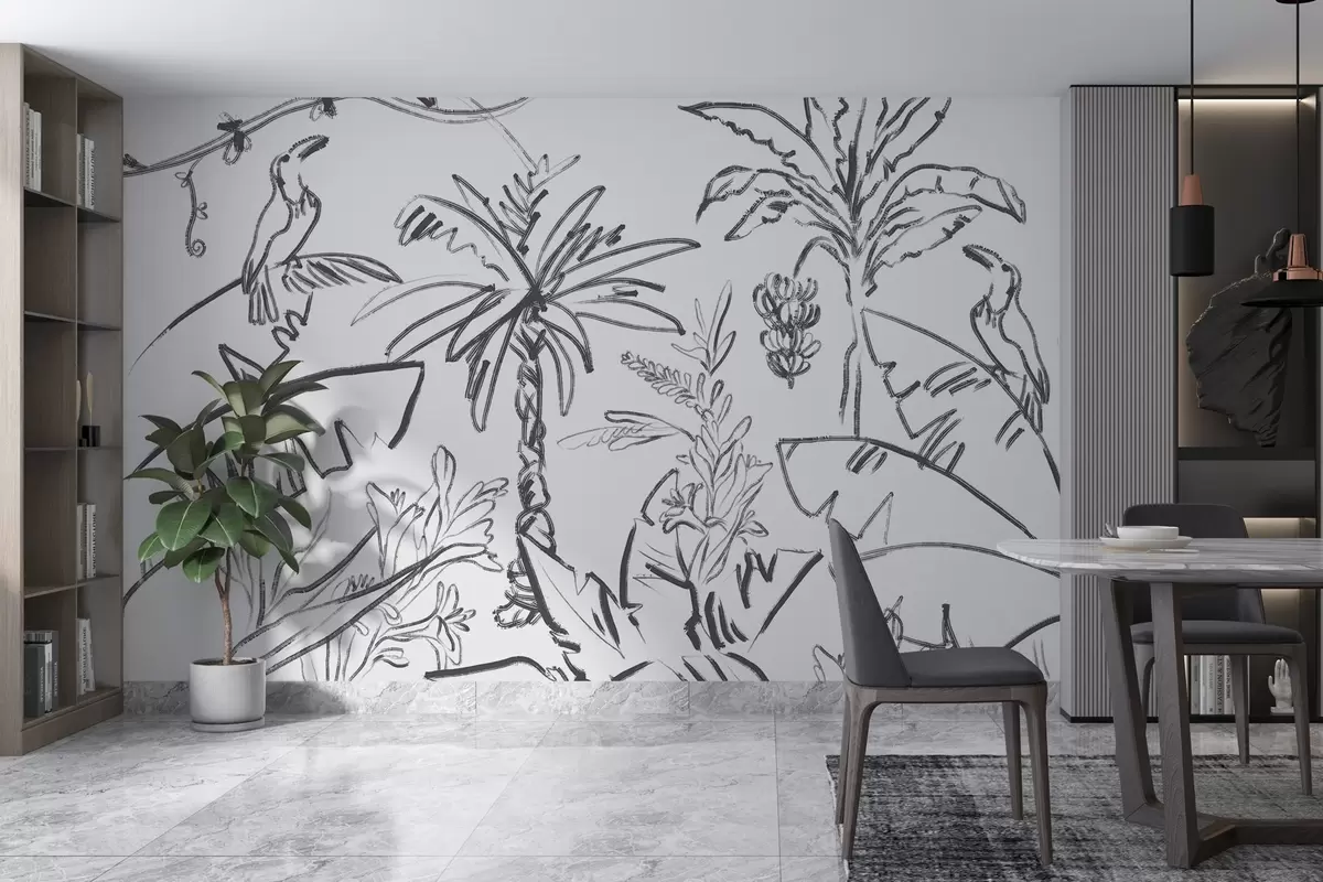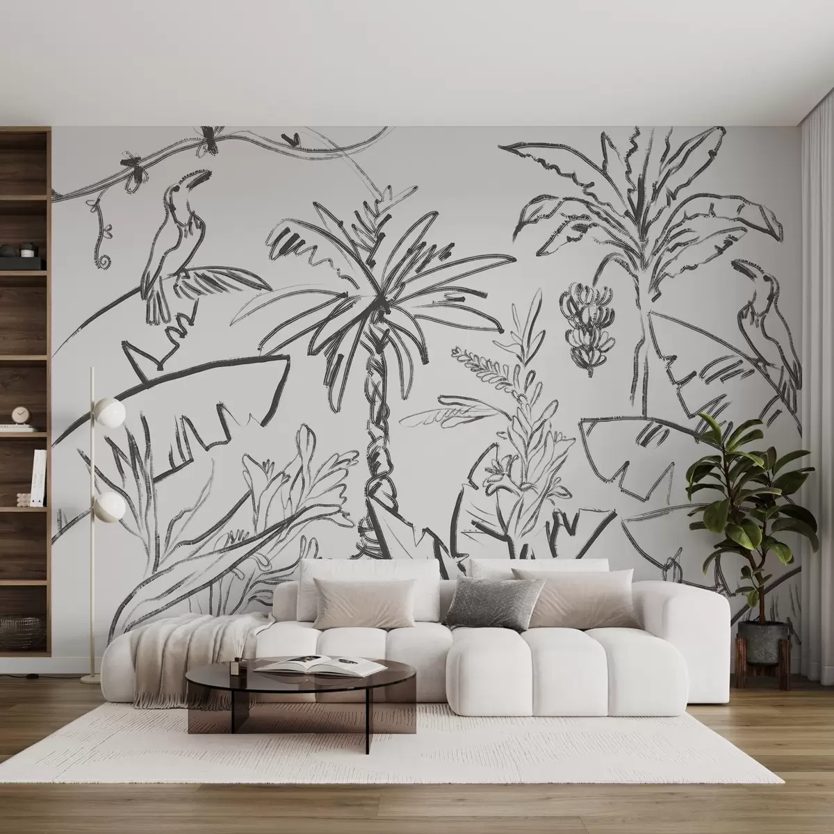 Fototapet Tropisk linjeteckning, bananer, palmer, konturgrafik Nr. w04020