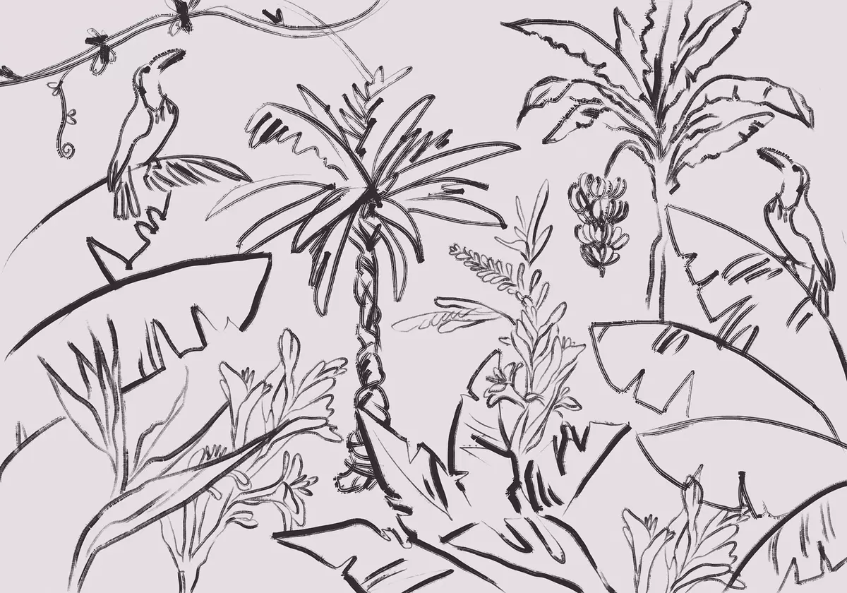 Fototapet Tropiskt mönster i svart färg, palmer, bananer, konturgrafik Nr. w04020v7