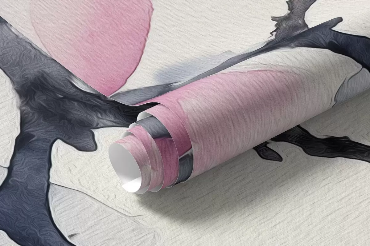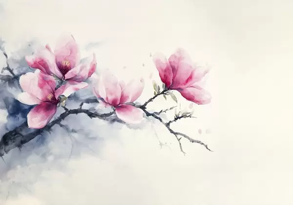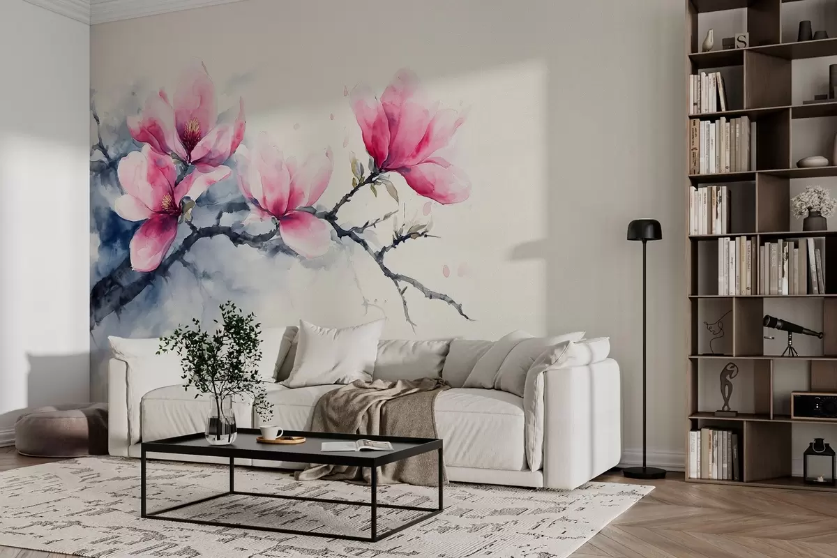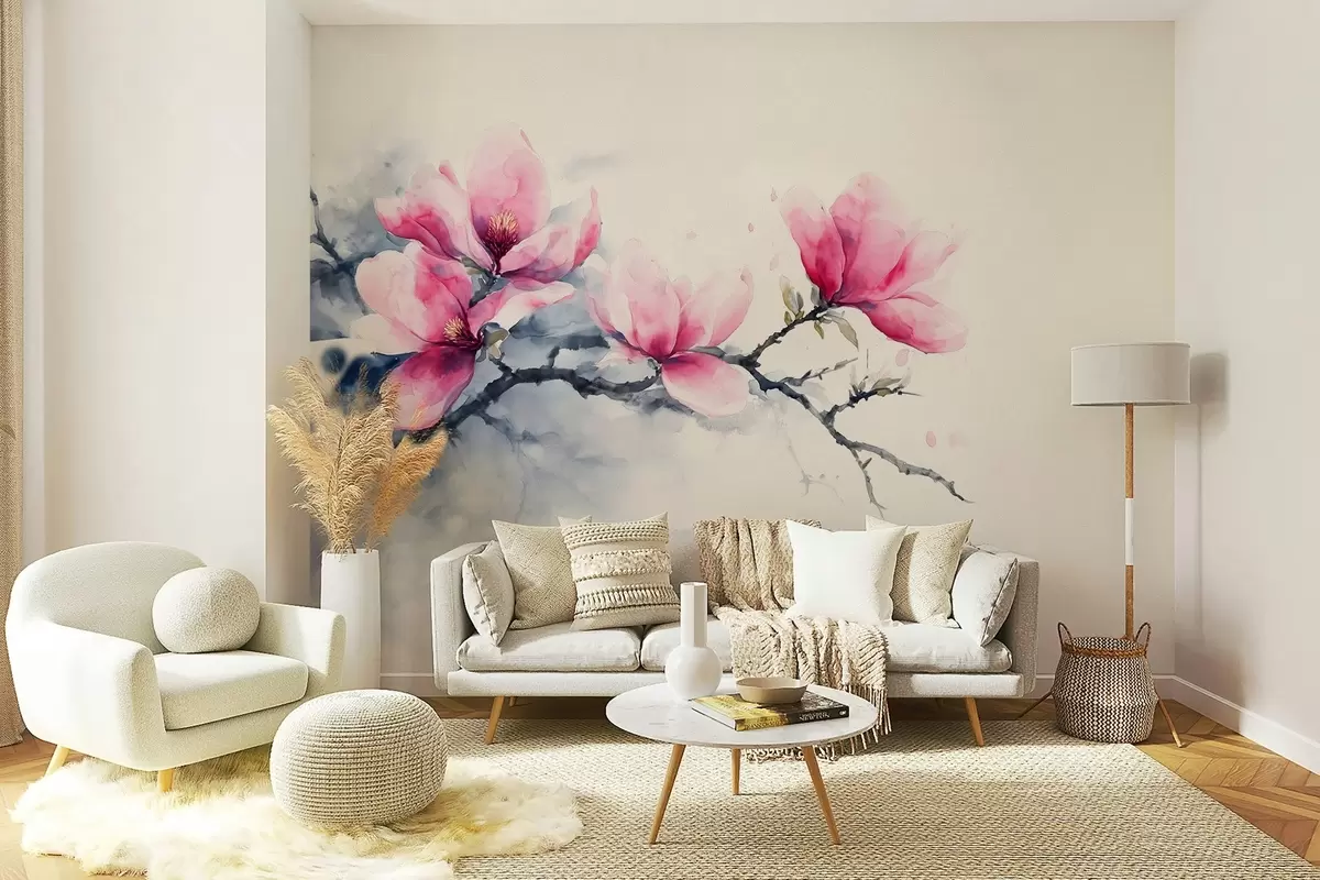 Fototapet blommande gren av rosa magnolia på en elfenbensfärgad bakgrund Nr. w04027