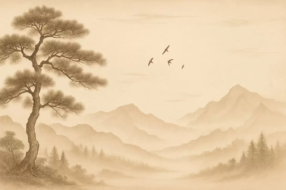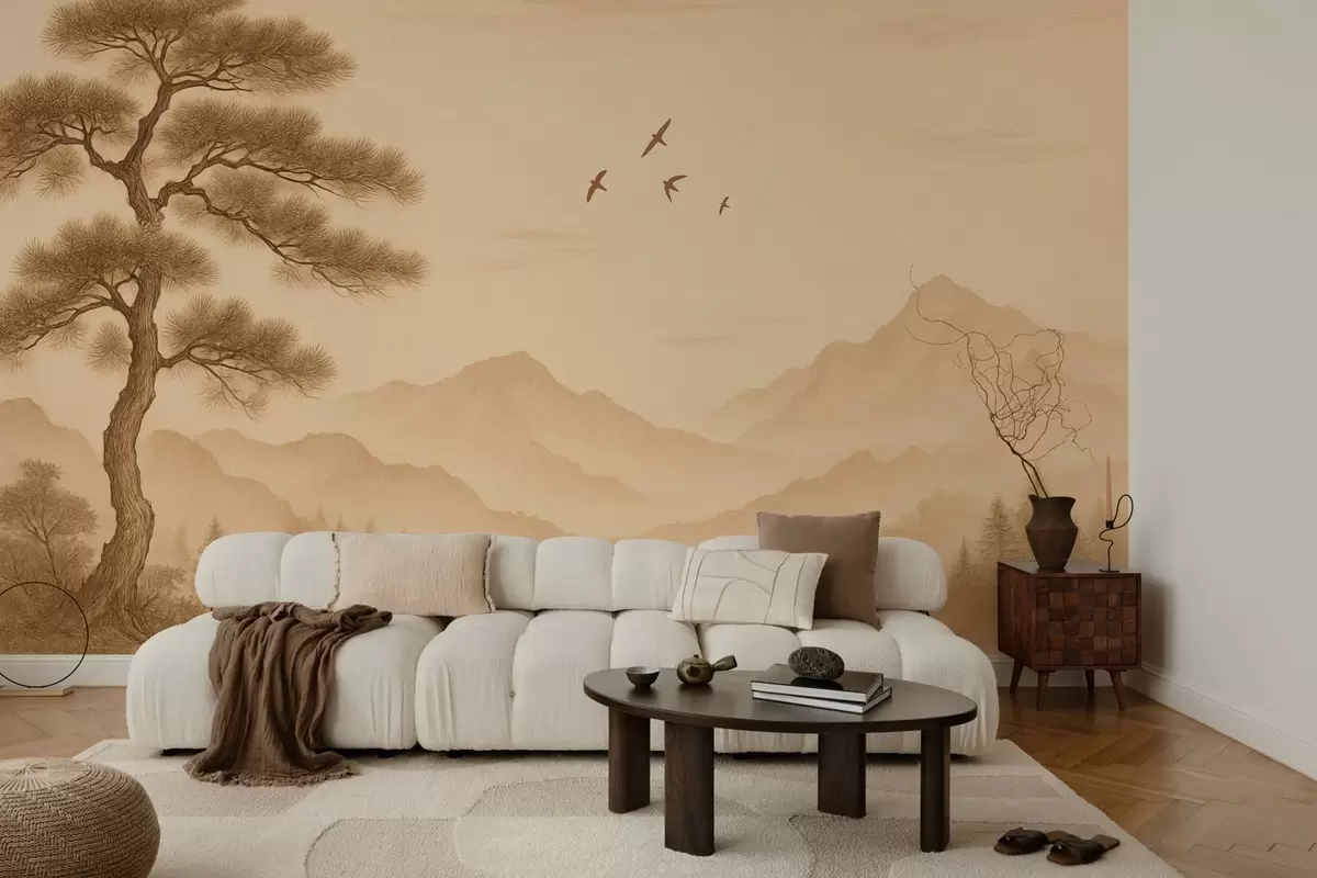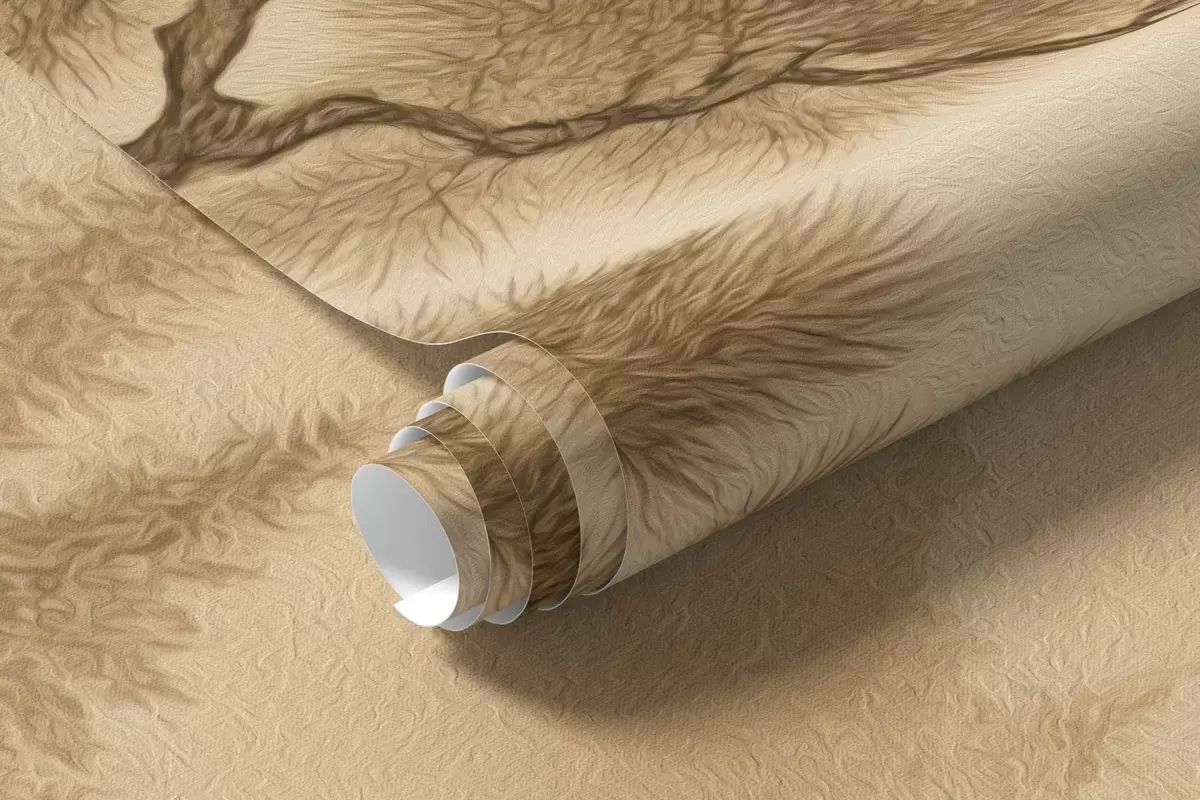 Fototapet panorama över kullarna med ett stort träd i sepia-stil Nr. w04033