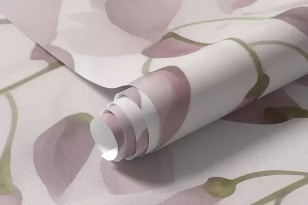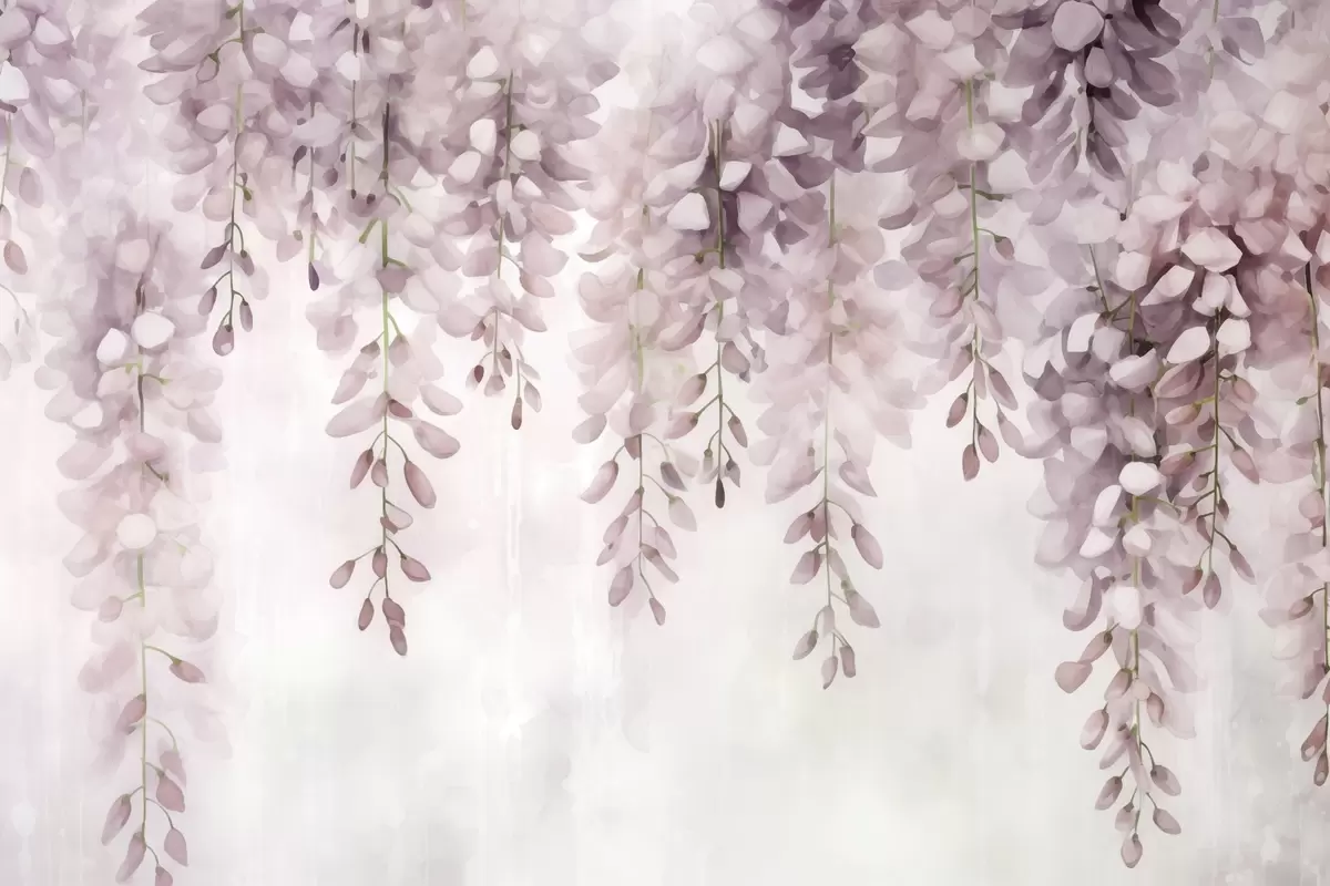 Fototapet Mjuk akvarellscen i krämiga rosa toner, med kaskadformade blåregnskluster som bildar en drömsk blommig gardin Nr. w04034v2