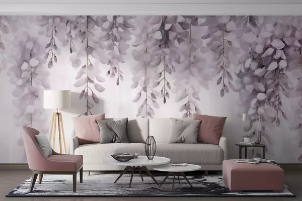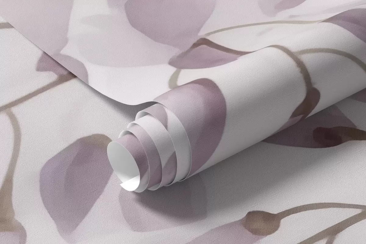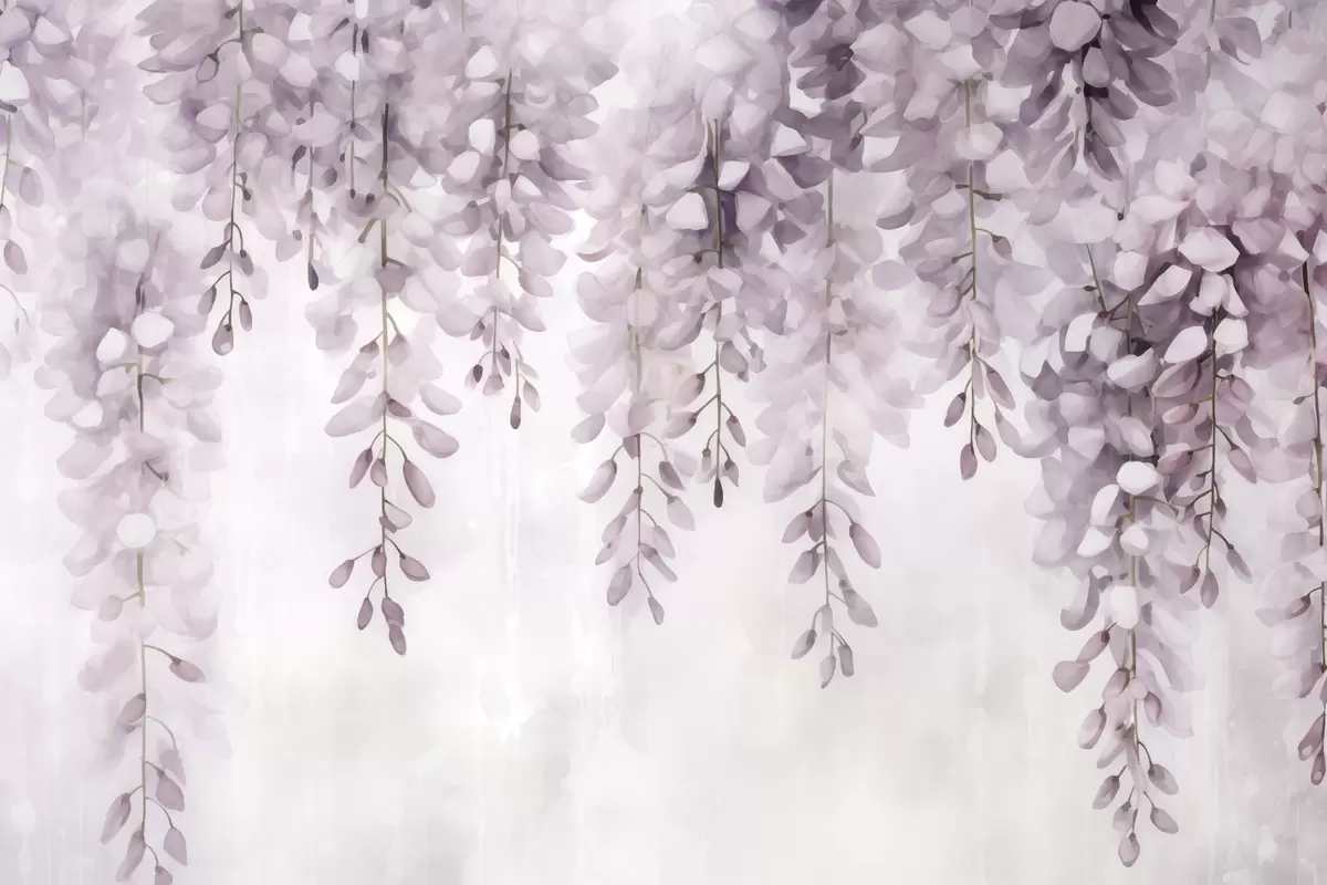 Fototapet Akvarellscen med mjukt lila blåregn som faller i kaskader från ovan, vilket framkallar lugnet och klarheten i en tidig morgondimma Nr. w04034v3