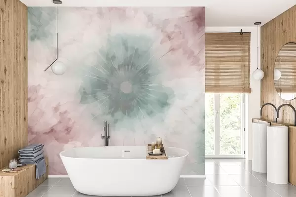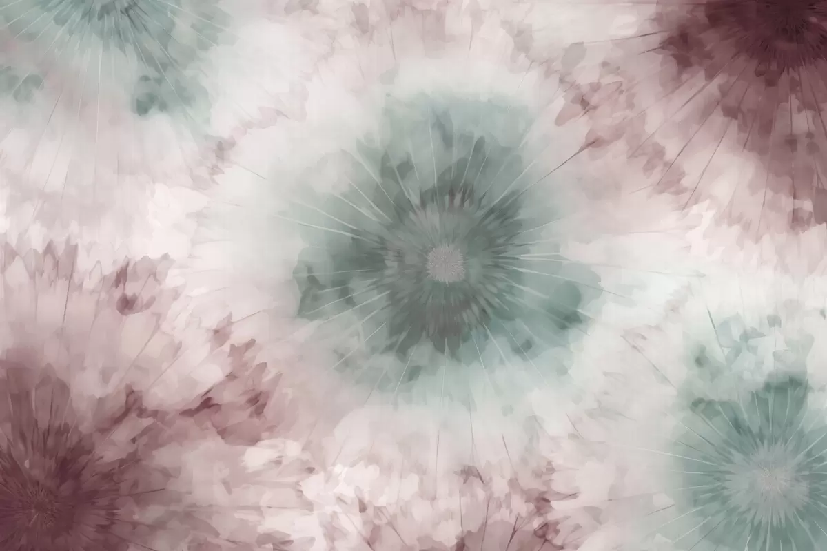 Fototapet Radiellt akvarellmönster som blandar dimmigt grönt och dammigt rosa och för tankarna till morgondaggens mjukhet och dagens första andetag Nr. w04036v2