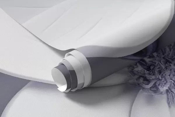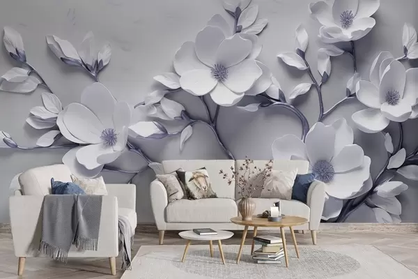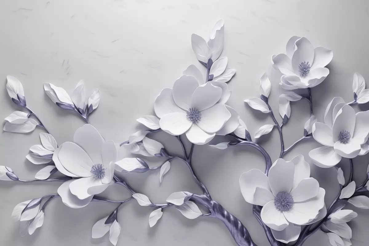 Fototapet Dimensionell blomsterdesign i mjuka vita och violettgrå toner Nr. w04039v1