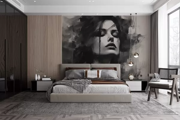 Fototapet Porträtt av en kvinna i grå och svarta plagg Nr. w04049