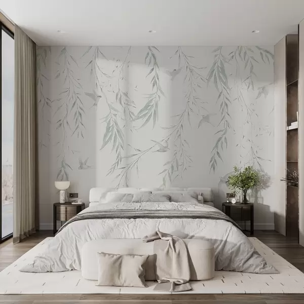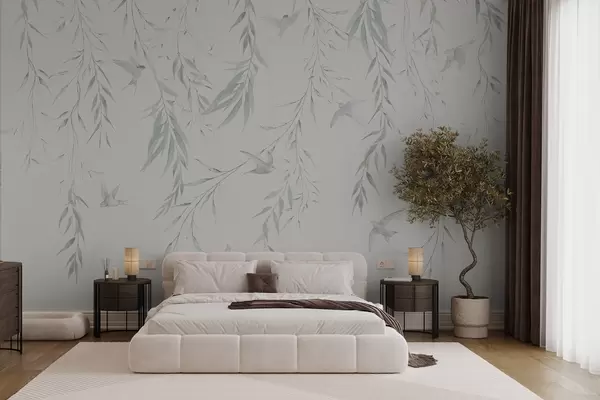 Fototapet Kvistar med gröna blad hängande och fåglar Nr. w04052