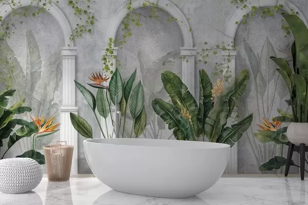 Fototapet Betongvägg med bågar och tropiska växter, blommiga, naturliga färger Nr. w04065