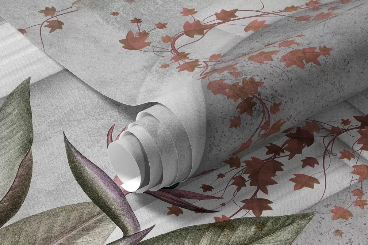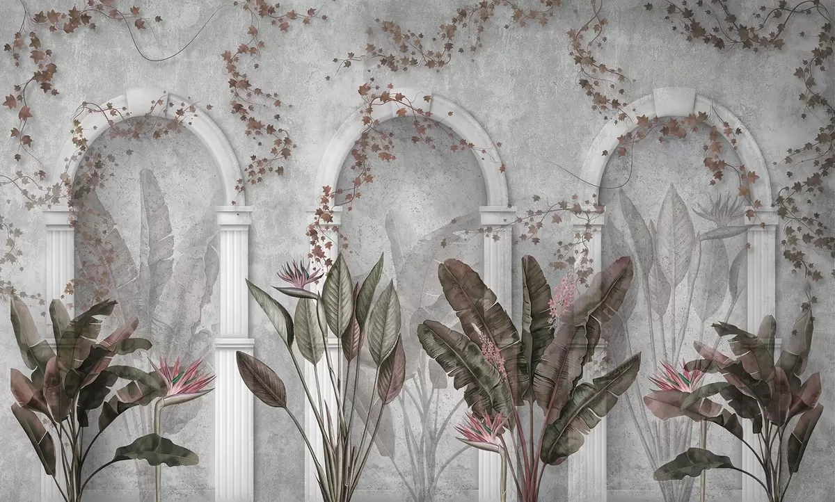 Fototapet Betongvägg med bågar och tropiska växter, blommiga, vinröda färger Nr. w04065v1