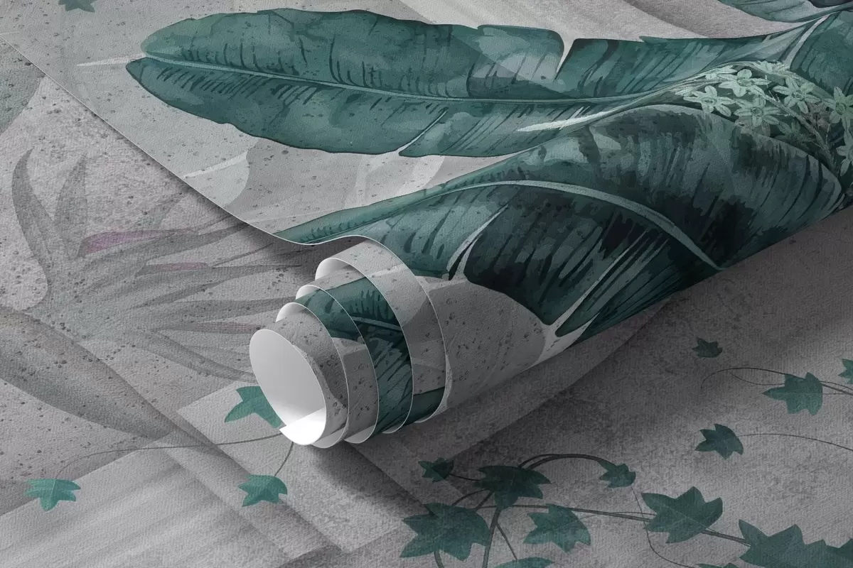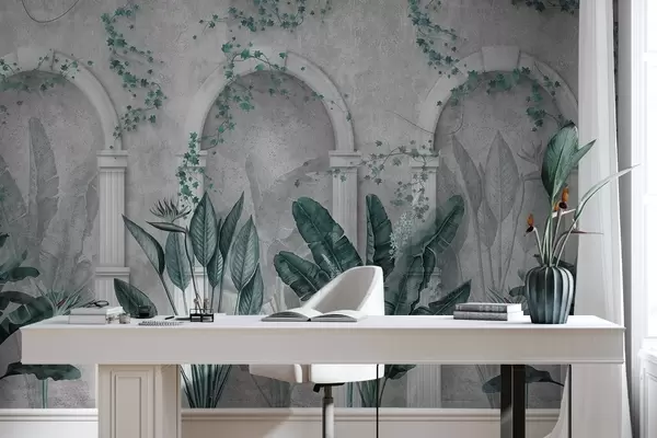 Fototapet Betongvägg med bågar och tropiska växter, blommiga, blå färger Nr. w04065v2