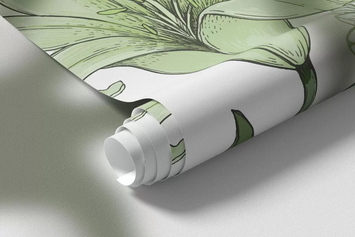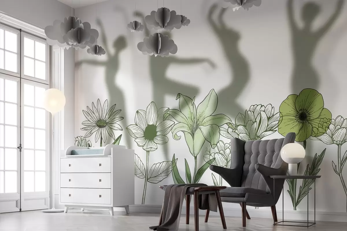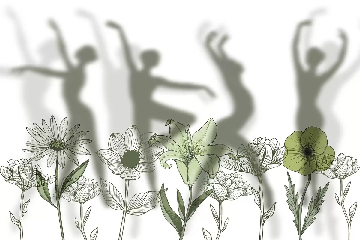 Fototapet Ballerinasilhuetter, rustika blommor, linjekonst, gröna färger Nr. w04069v1
