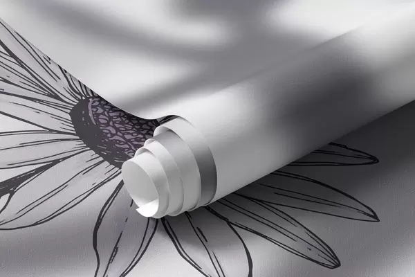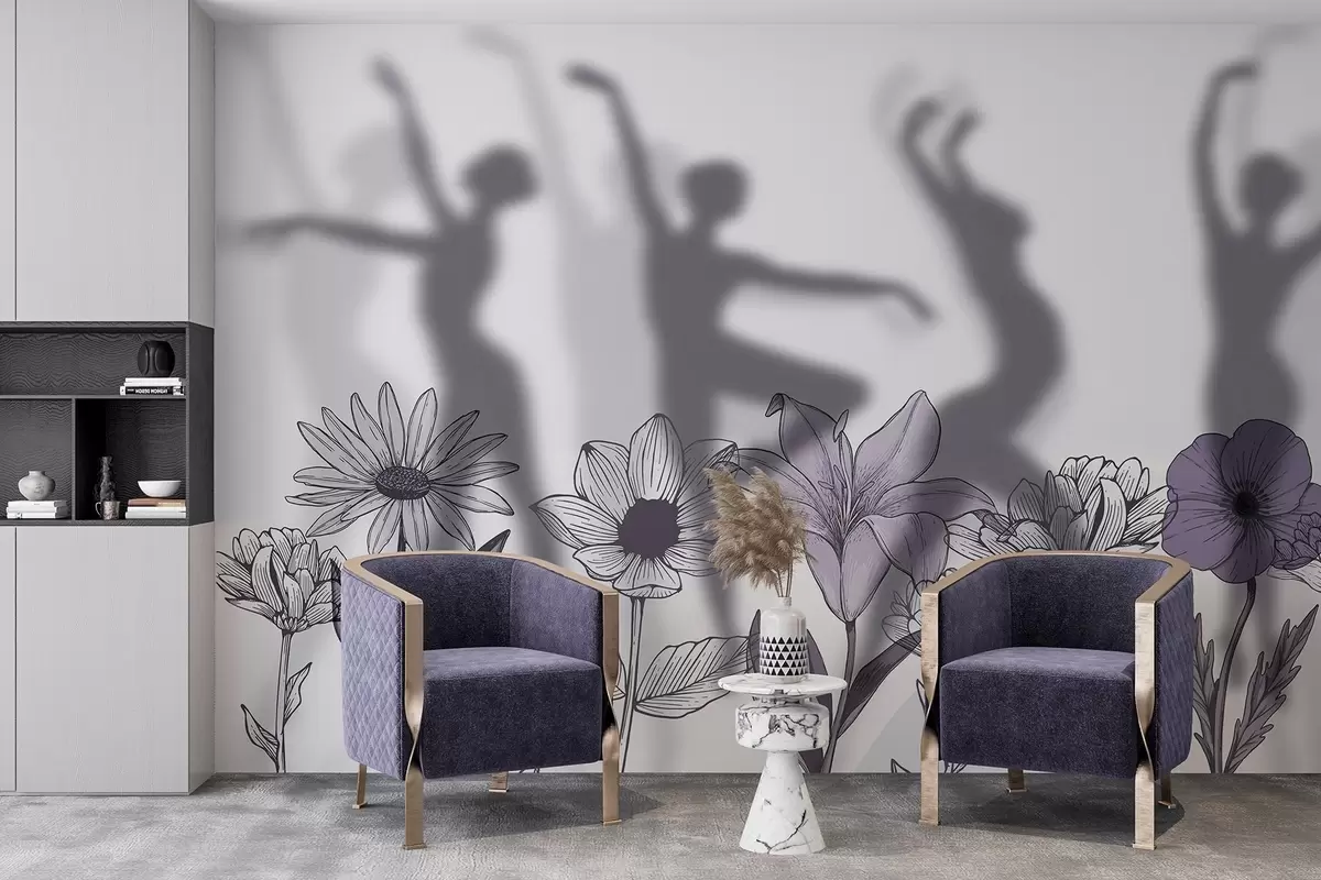 Fototapet Ballerinasilhuetter, rustika blommor, linjekonst, grå och lila färger Nr. w04069v2