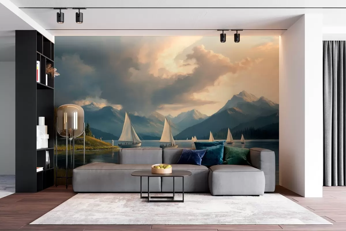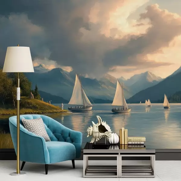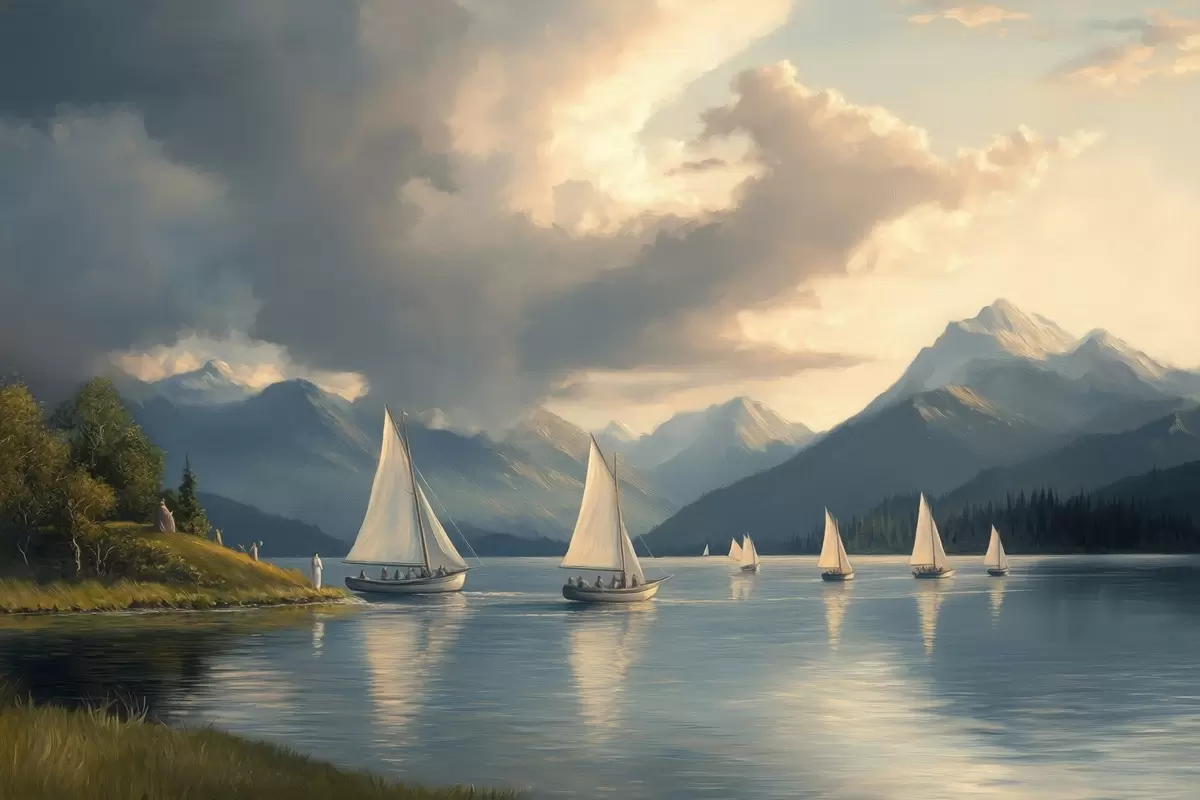 Fototapet regatta på en sjö med molnig himmel i stil med en oljemålning från 1800-talet Nr. w04076