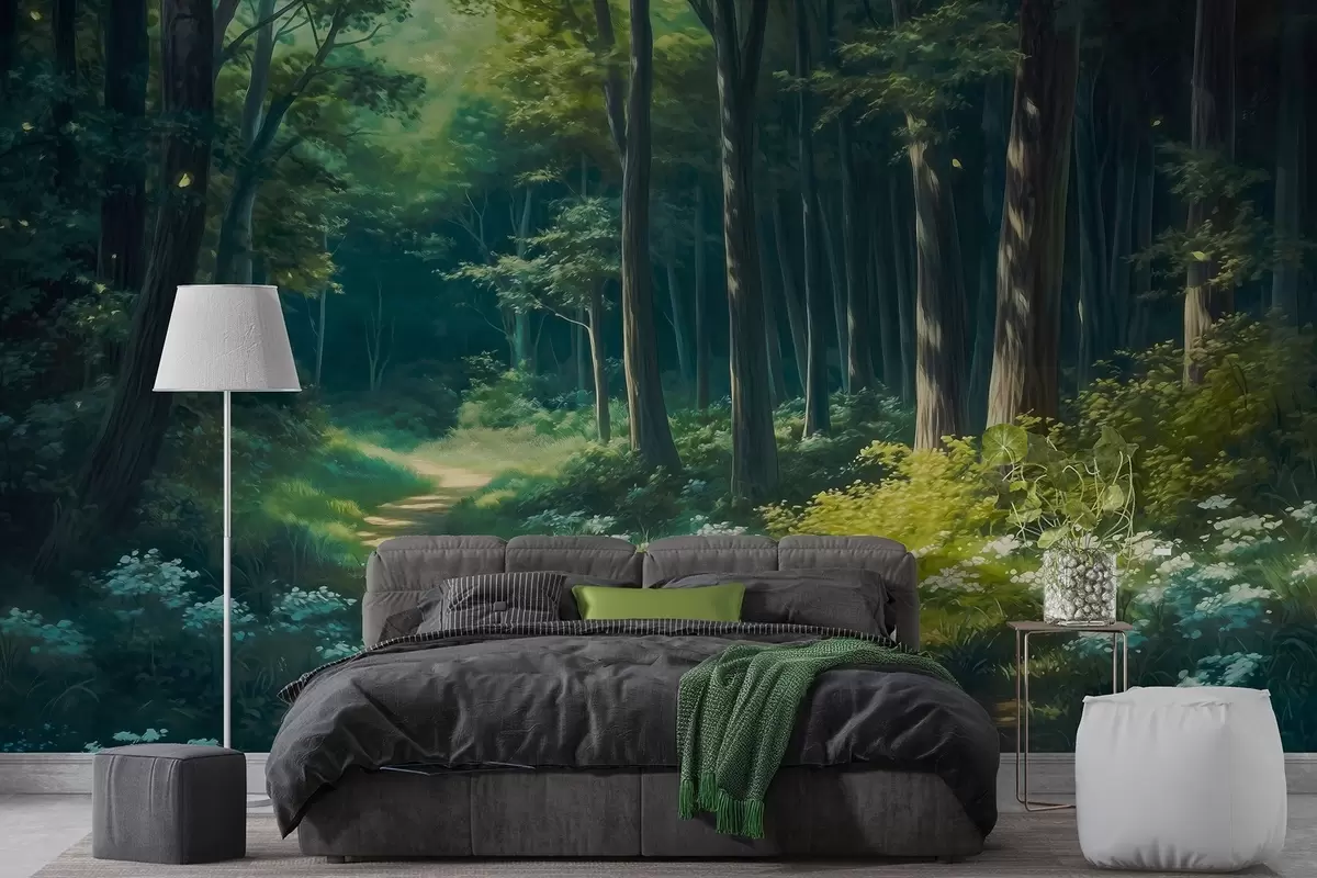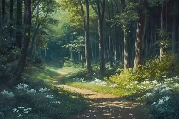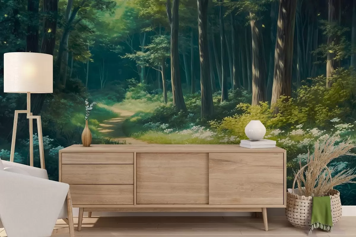 Fototapet Grön skog med milt solljus, träd och vita blommor, teckning i oljestil Nr. w04118