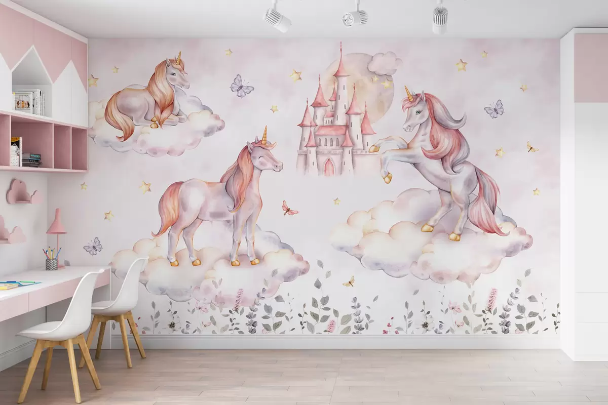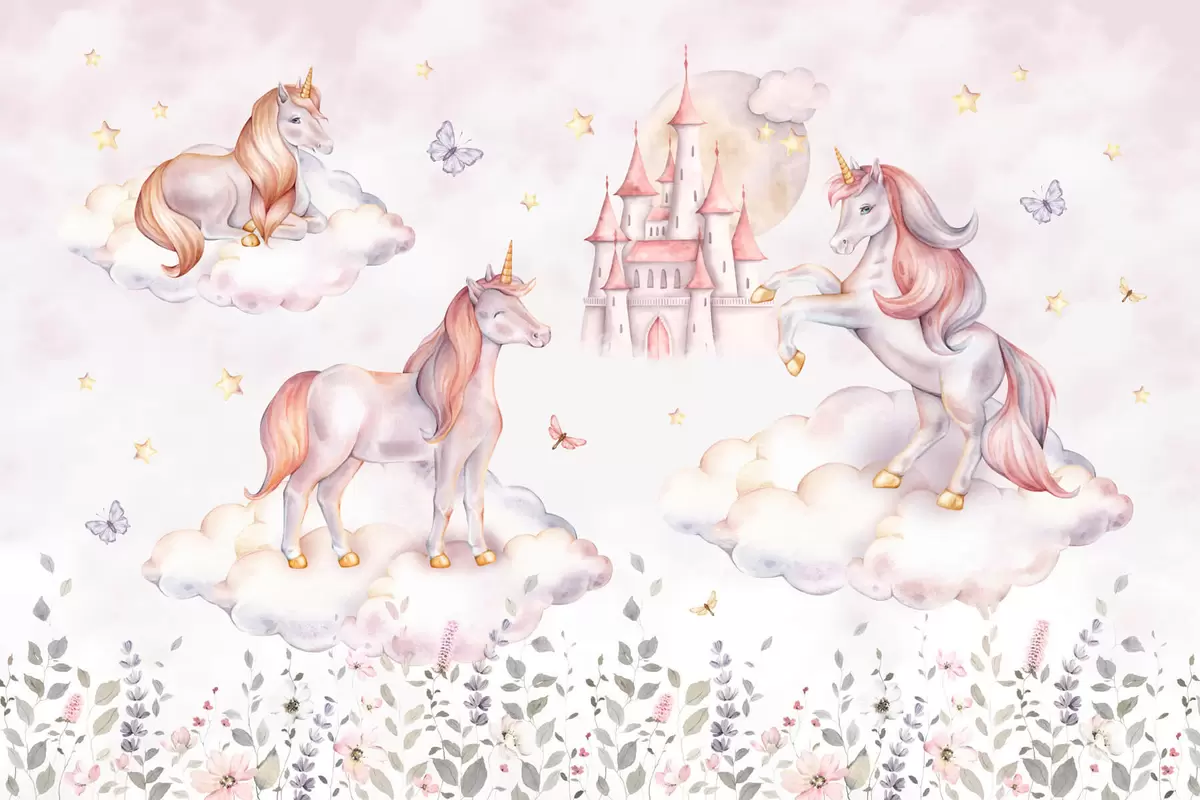 Fototapet Enhörningar i molnen med stjärnor, fjärilar och blommor Nr. w04165