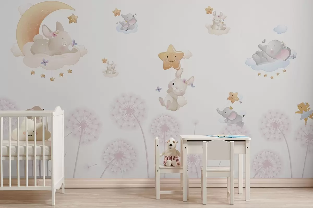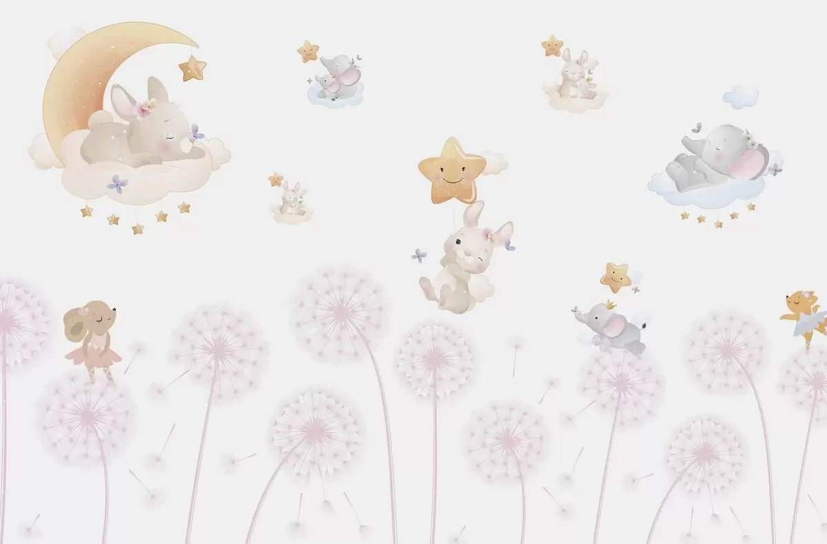 Fototapet Söt kanin och stjärnor bland maskrosor på en vit bakgrund Nr. w04195