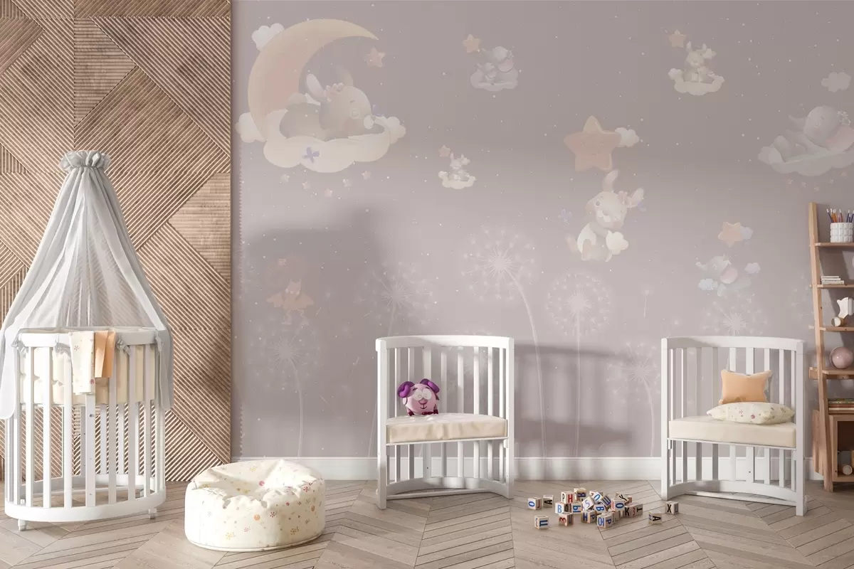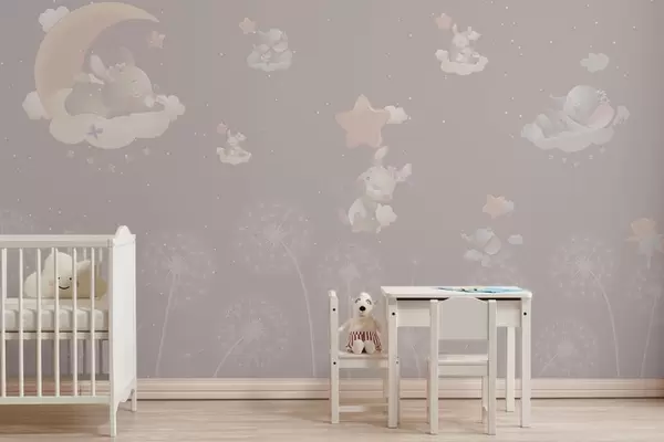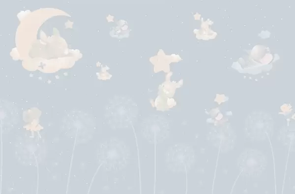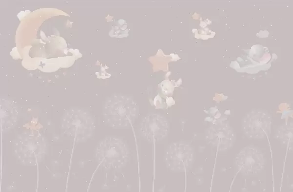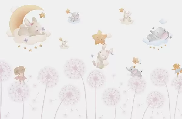 Fototapet Sagolik natt med kanin och maskrosor på en rosa bakgrund Nr. w04195v2