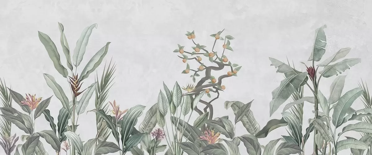 Fototapet Tropiska växter med apelsinträd mot en ljus bakgrund Nr. w04201