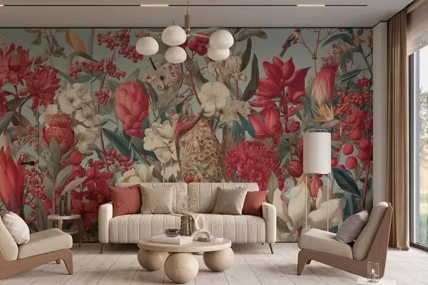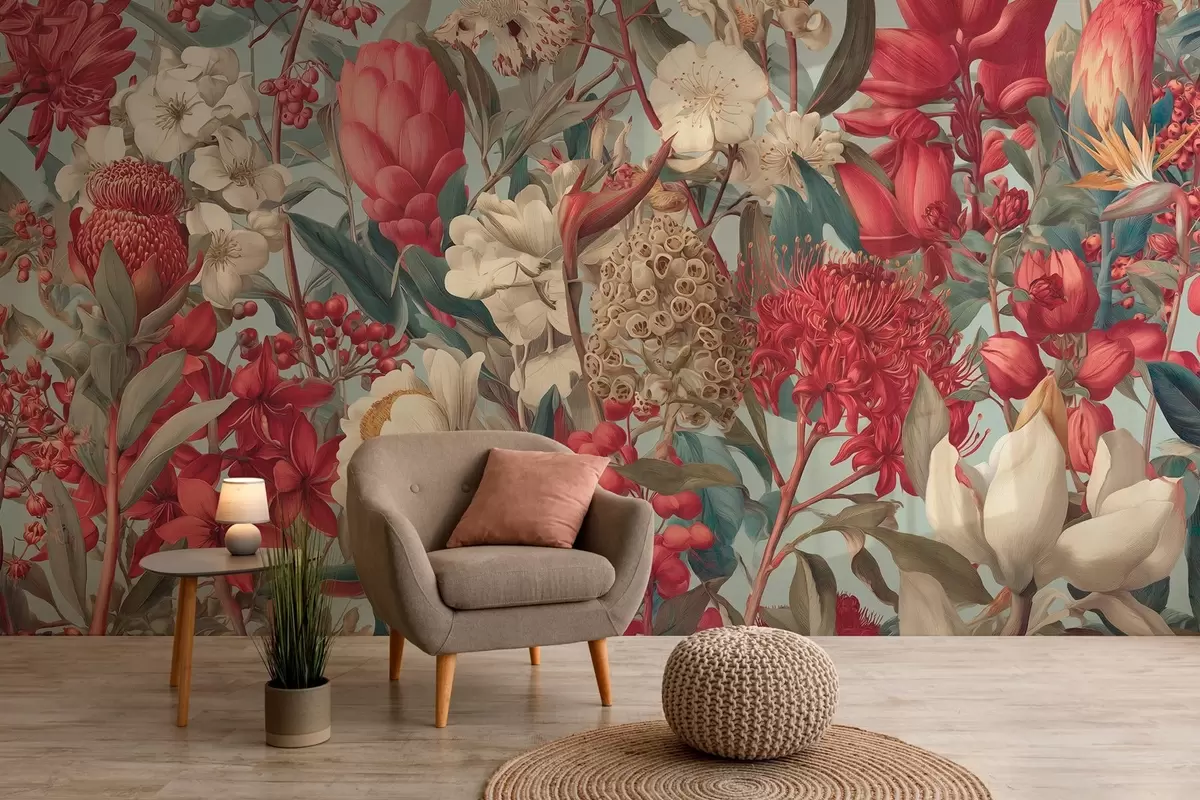 Fototapet texturerade tropiska blommor på en blå bakgrund Nr. w04209