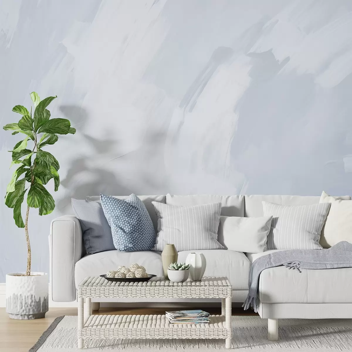 Du kan rengöra tapeten mycket försiktigt med en lätt fuktad svamp. Vi rekommenderar dock inte att du skrubbar eller använder rengöringsmedel för att rengöra tapeten, eftersom det kan skada tapetens yta och färger.