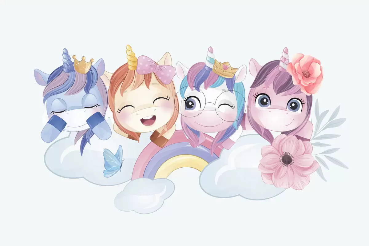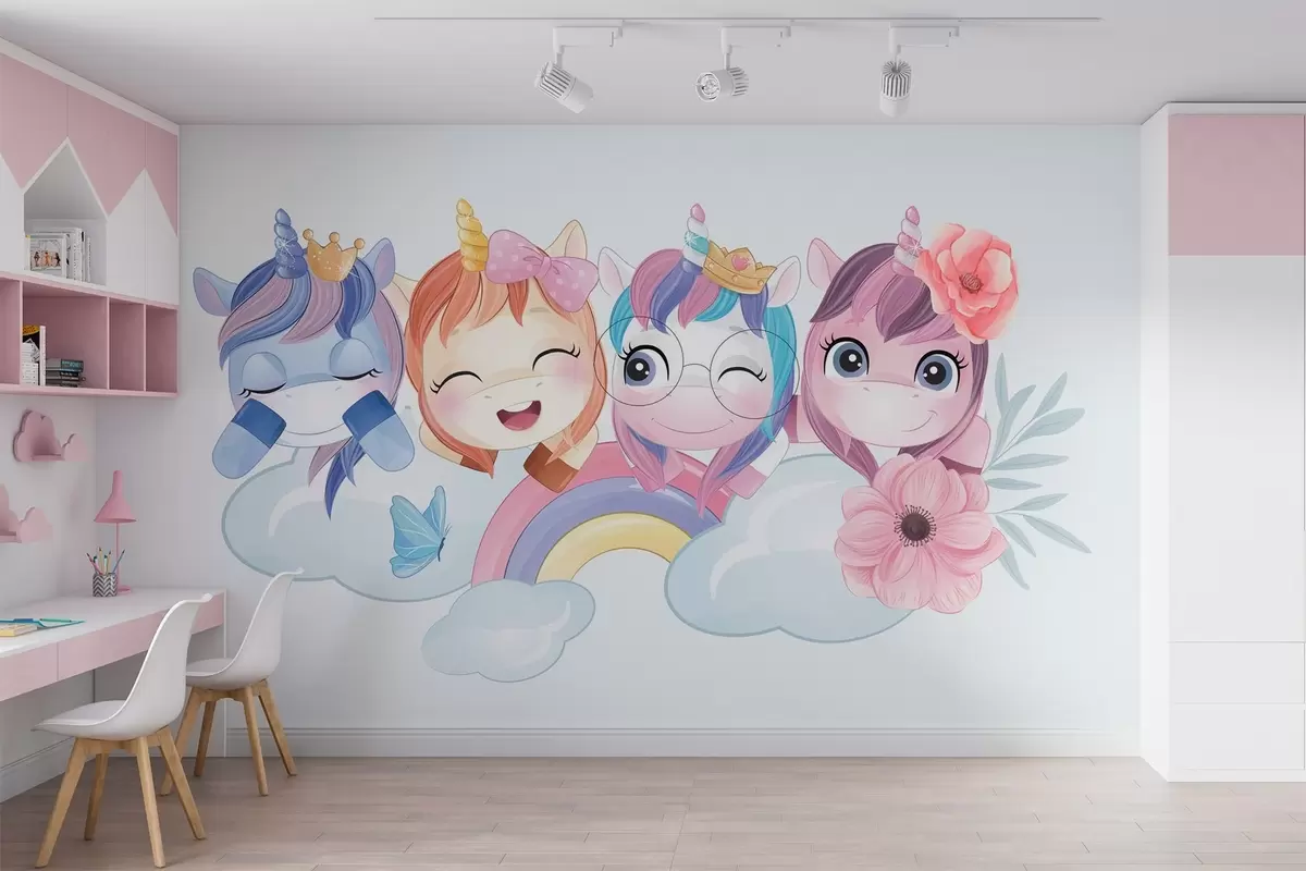 Fototapet Söta enhörningar bland moln och regnbågar Nr. w04298