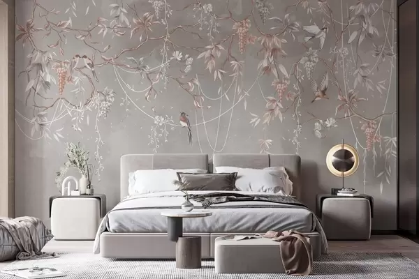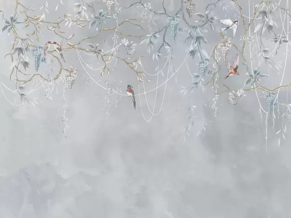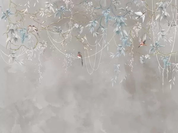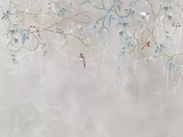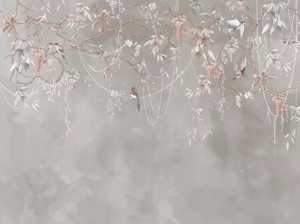 Fototapet Grenar med vindruvor och fåglar på varm grå-rosa bakgrund Nr. w04302