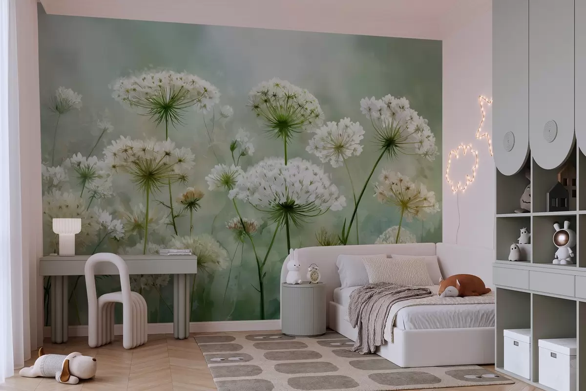 Fototapet skira vita vildblommor Queen Anne, i en pittoresk stil, gröna toner Nr. w04313