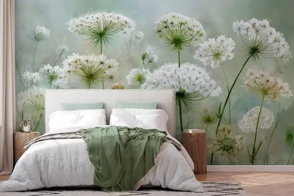 Fototapet skira vita vildblommor Queen Anne, i en pittoresk stil, gröna toner Nr. w04313