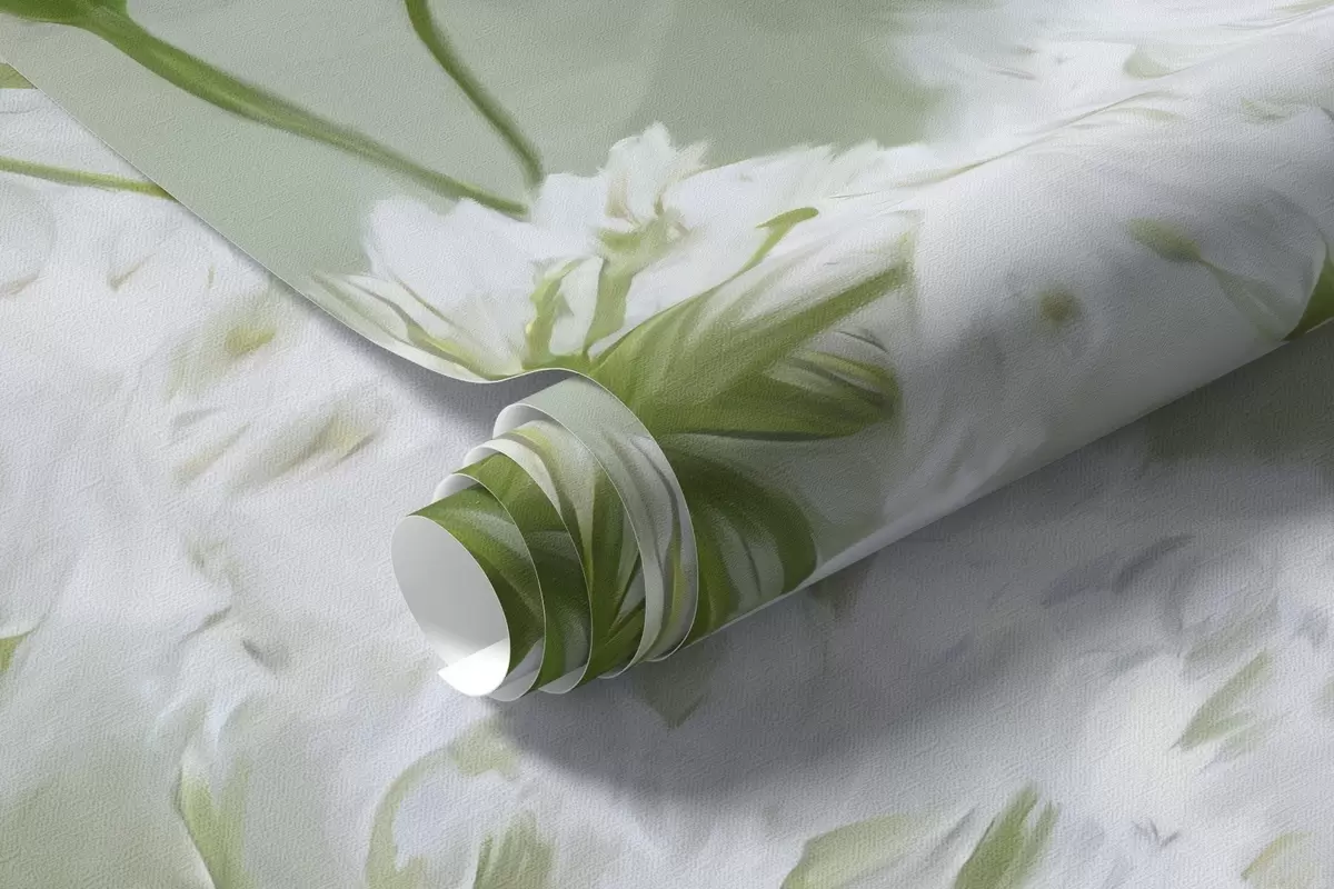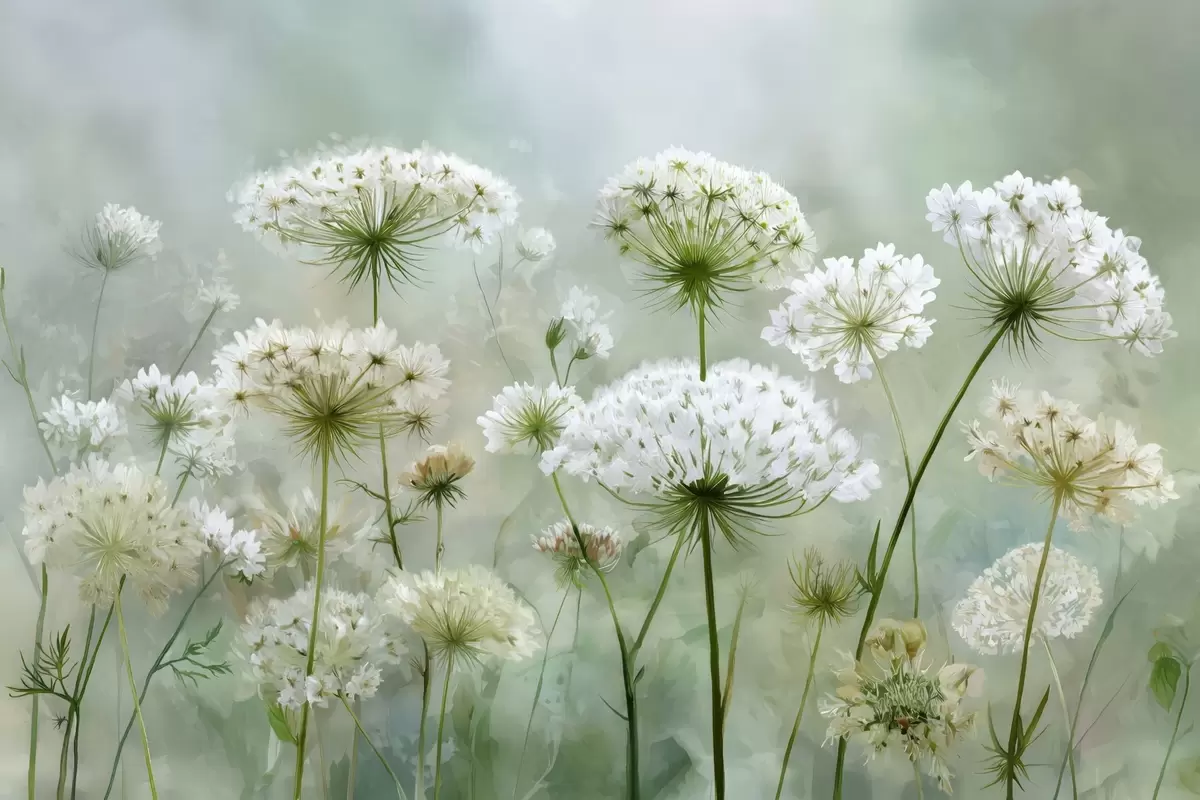 Fototapet skira vita vildblommor Queen Anne, i en pittoresk stil, gröna toner w04313