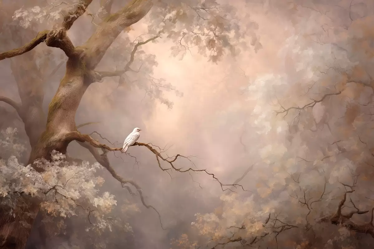 Fototapet mystisk skog med vit fågel Nr. w04314