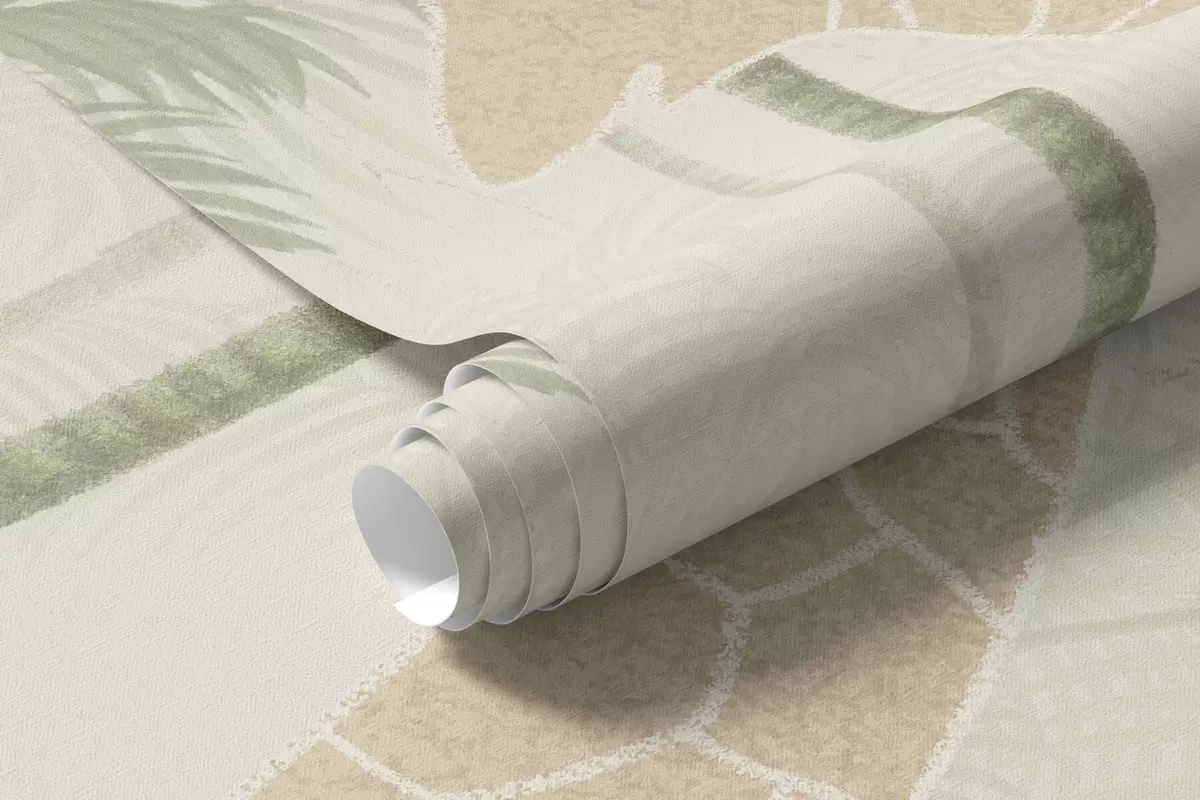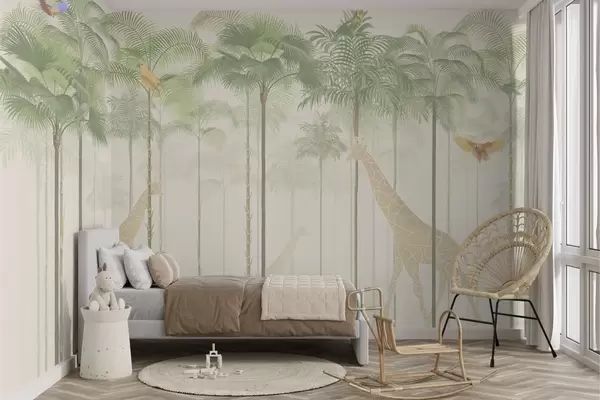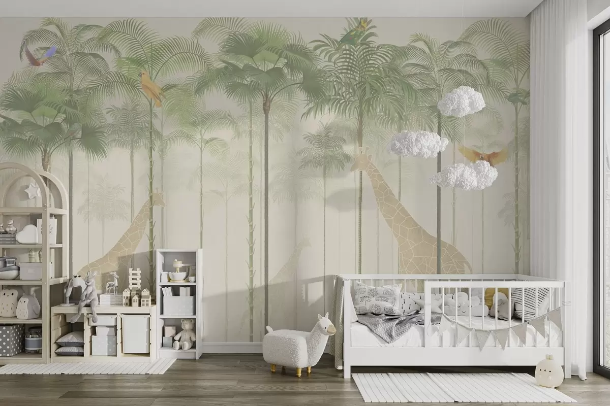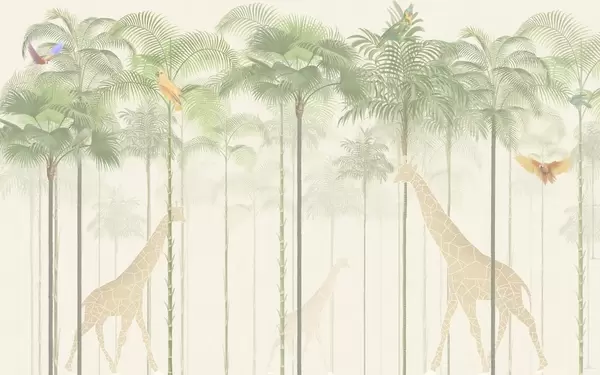 Fototapet Giraffer och tropiska fåglar bland höga palmer Nr. w04400
