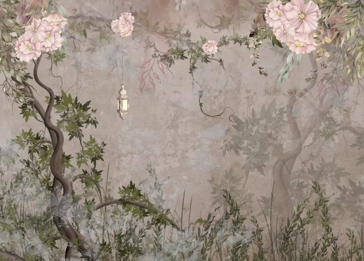 Fototapet Sagoträdgård med blommor, träd och lykta Nr. w04416