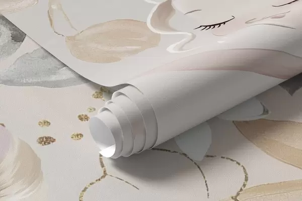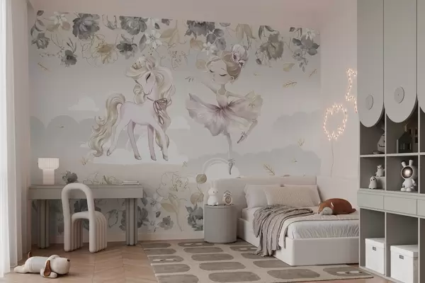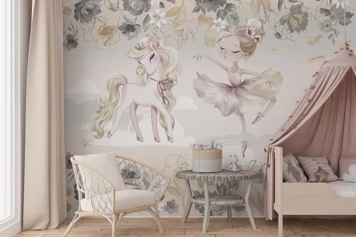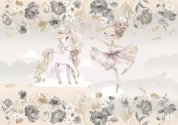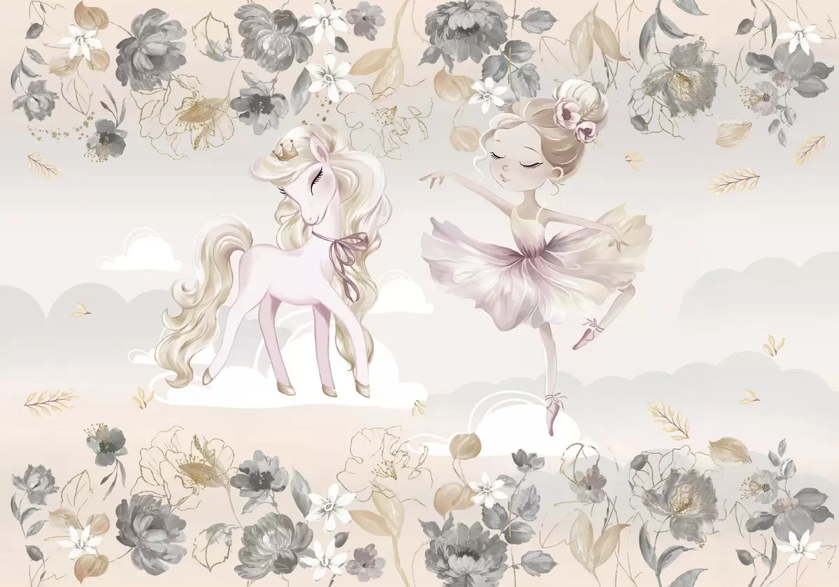 Fototapet Snövit ponny och ballerina bland blommor och moln Nr. w04419
