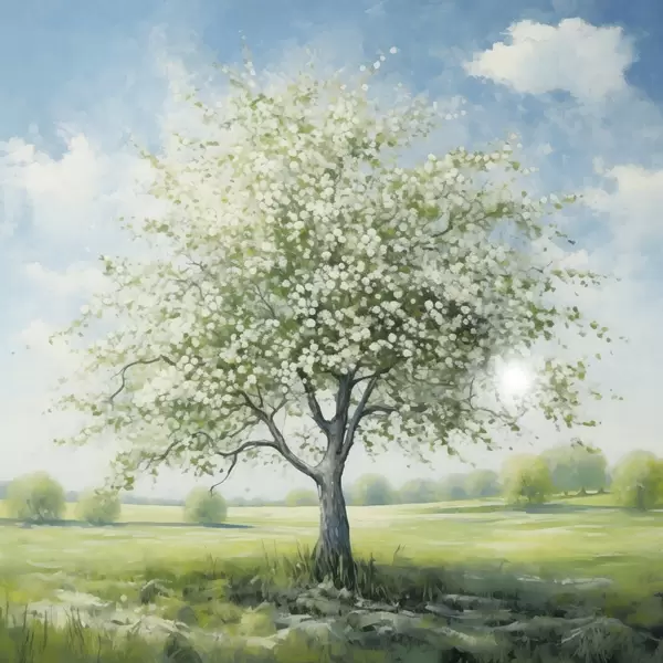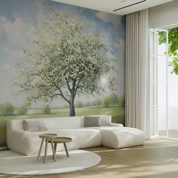 Fototapet Ett ensamt träd i ett fält med vita blommor Nr. w04445