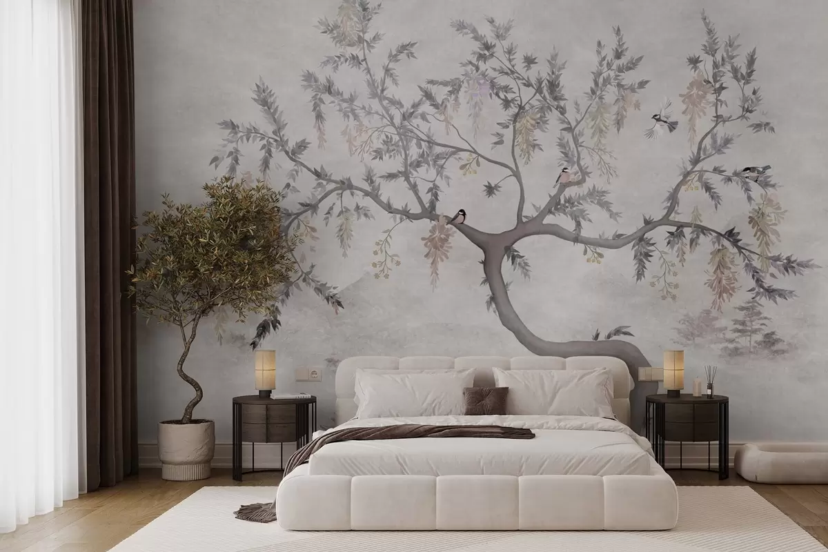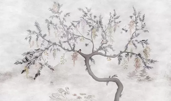 Fototapet Trädgren med fåglar i orientalisk stil Nr. w04456