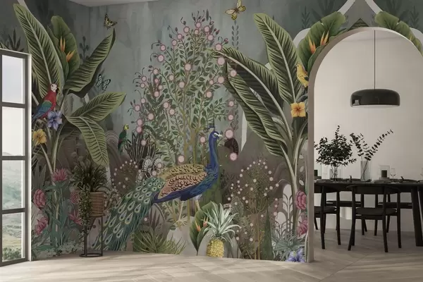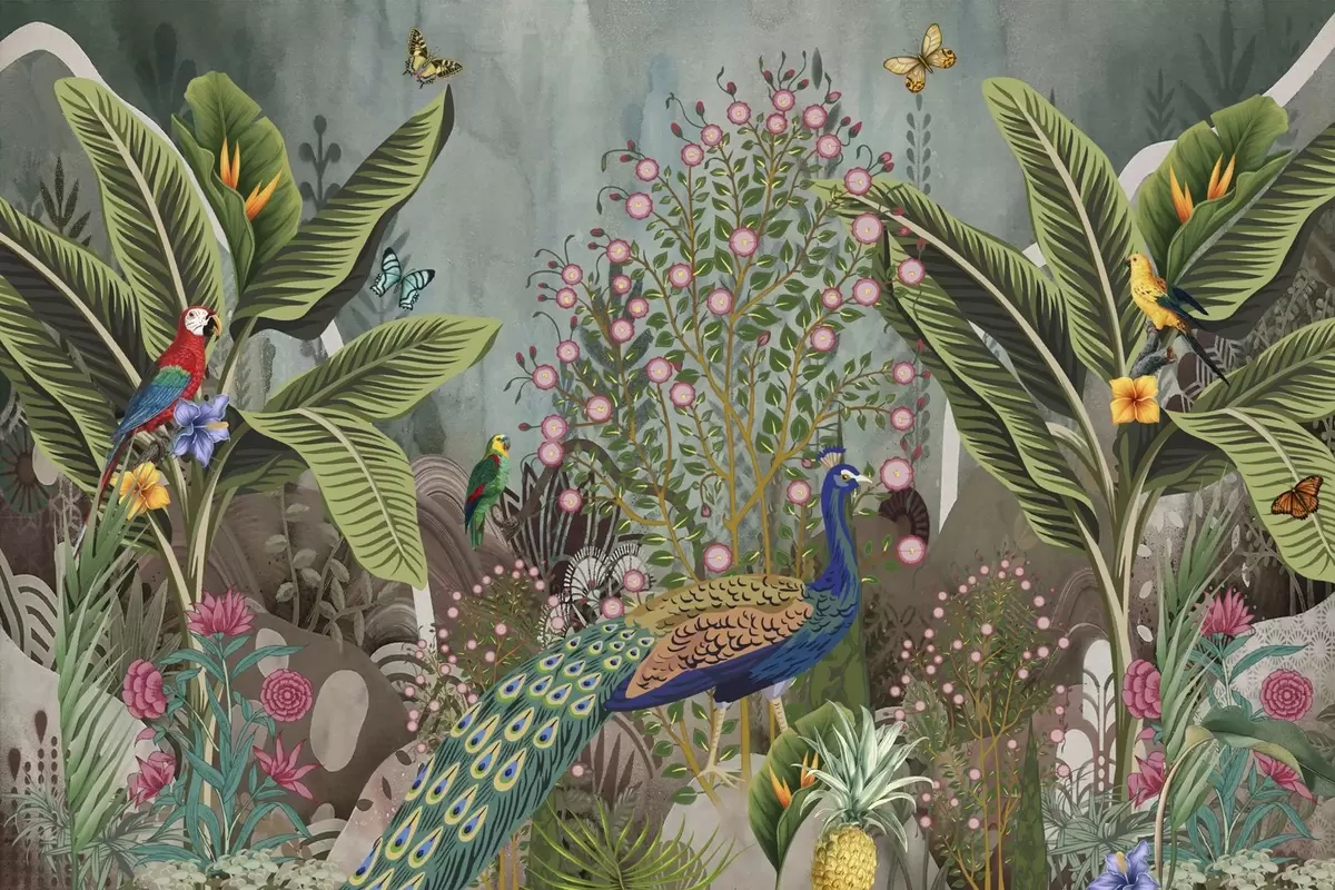 Fototapet Färgglada tropiska fåglar och påfågel bland exotiska växter Nr. w04457
