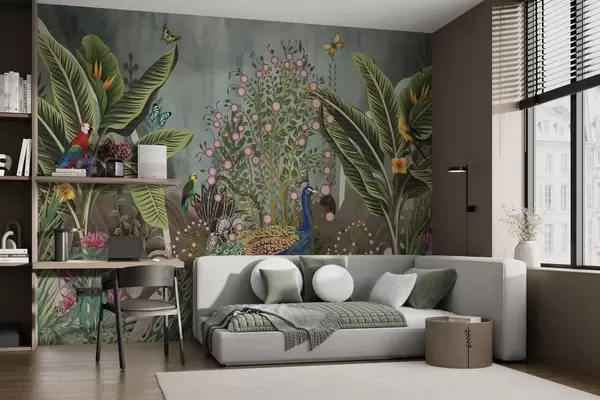 Fototapet Färgglada tropiska fåglar och påfågel bland exotiska växter Nr. w04457