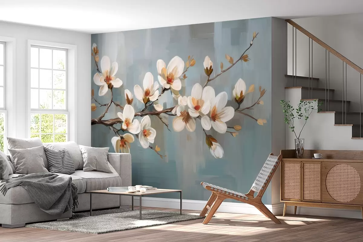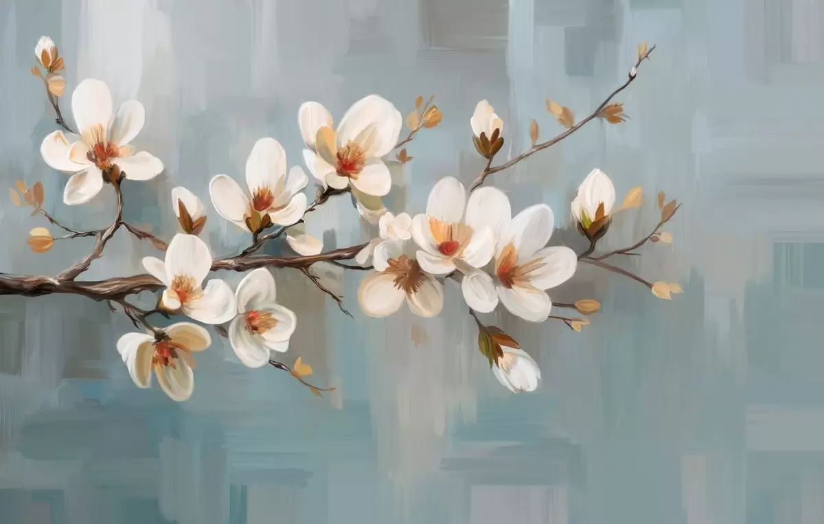 Fototapet En blommande gren i stil med oljemålning på en blå bakgrund Nr. w04496