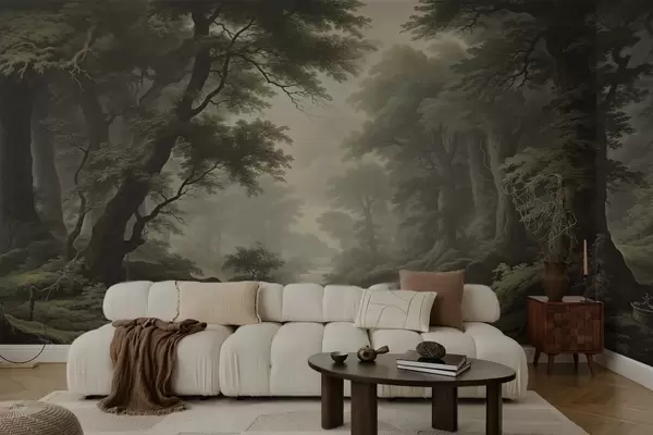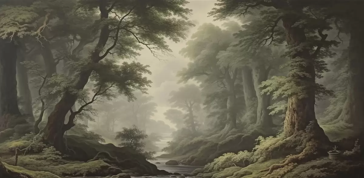 Fototapet Dimskog med flod och höga gamla träd Nr. w04555