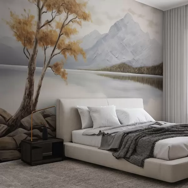 Fototapet Höstträd vid en bergsjö, lugna pastellfärger Nr. w04611