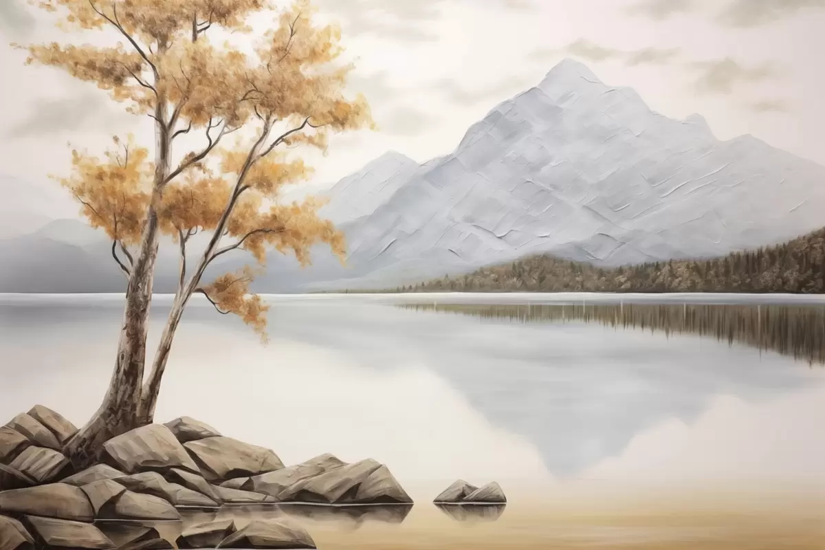 Fototapet Höstträd vid en bergsjö, lugna pastellfärger Nr. w04611