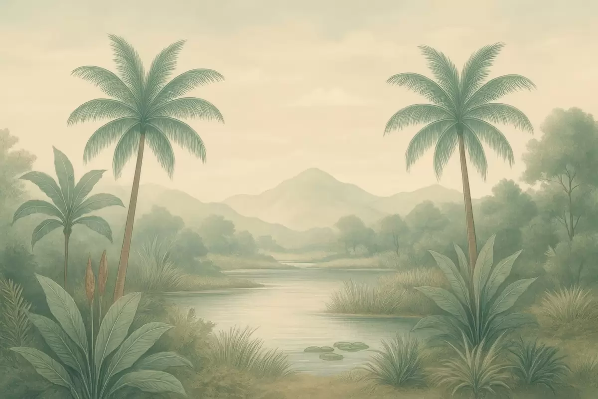 Fototapet tropiskt landskap med palmer och en flod Nr. w04623