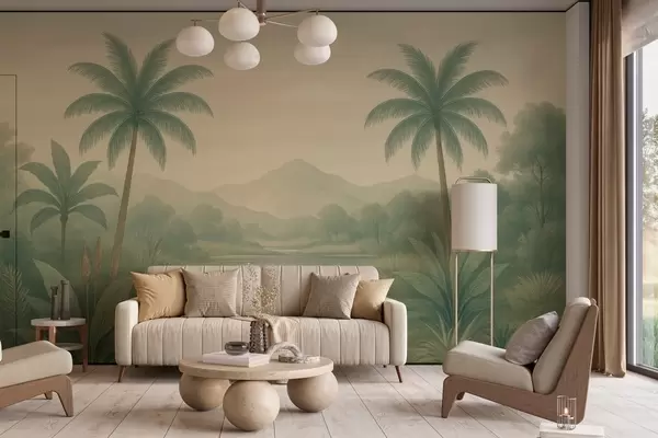 Fototapet tropiskt landskap med palmer och en flod w04623