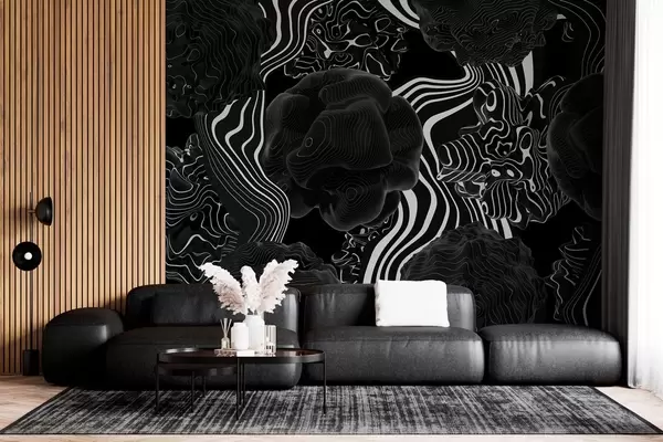 Fototapet abstrakta organiska former i 3D-stil i svarta toner med vita ränder Nr. w04628