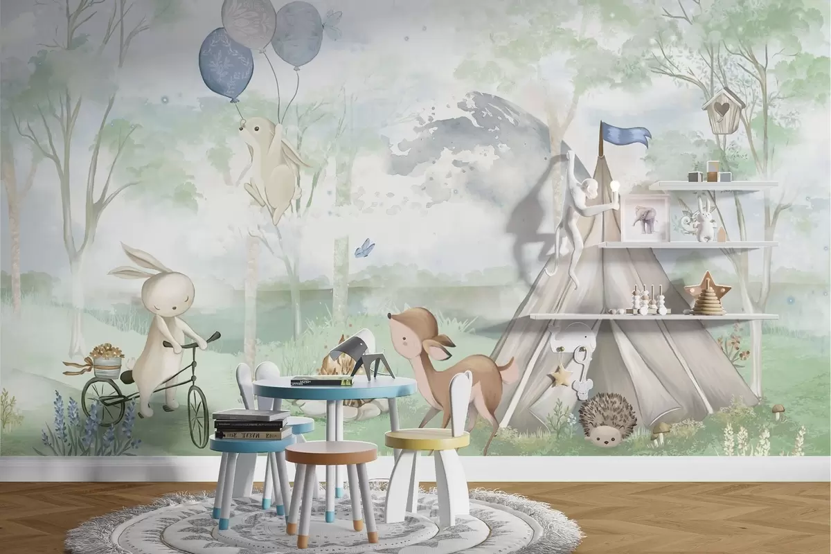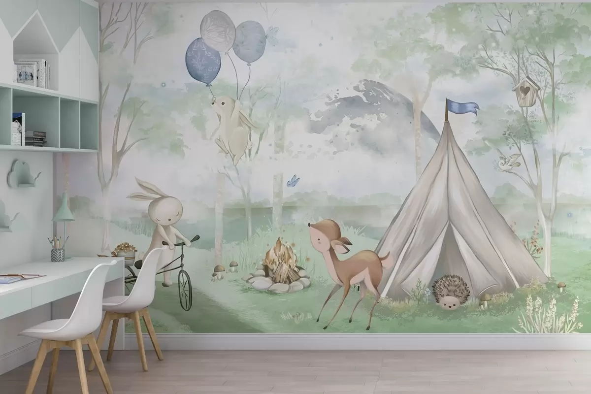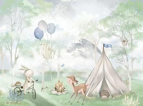 Fototapet Barnens skogsläger: kaniner, rådjur, tält och lägereld Nr. w04671v1