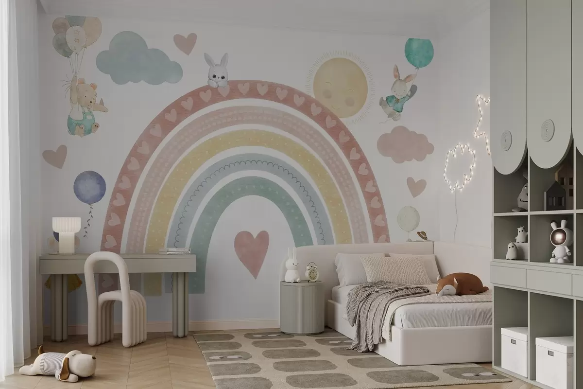 Fototapet Pastellfärgad regnbåge med hjärtan, djur och ballonger Nr. w04681